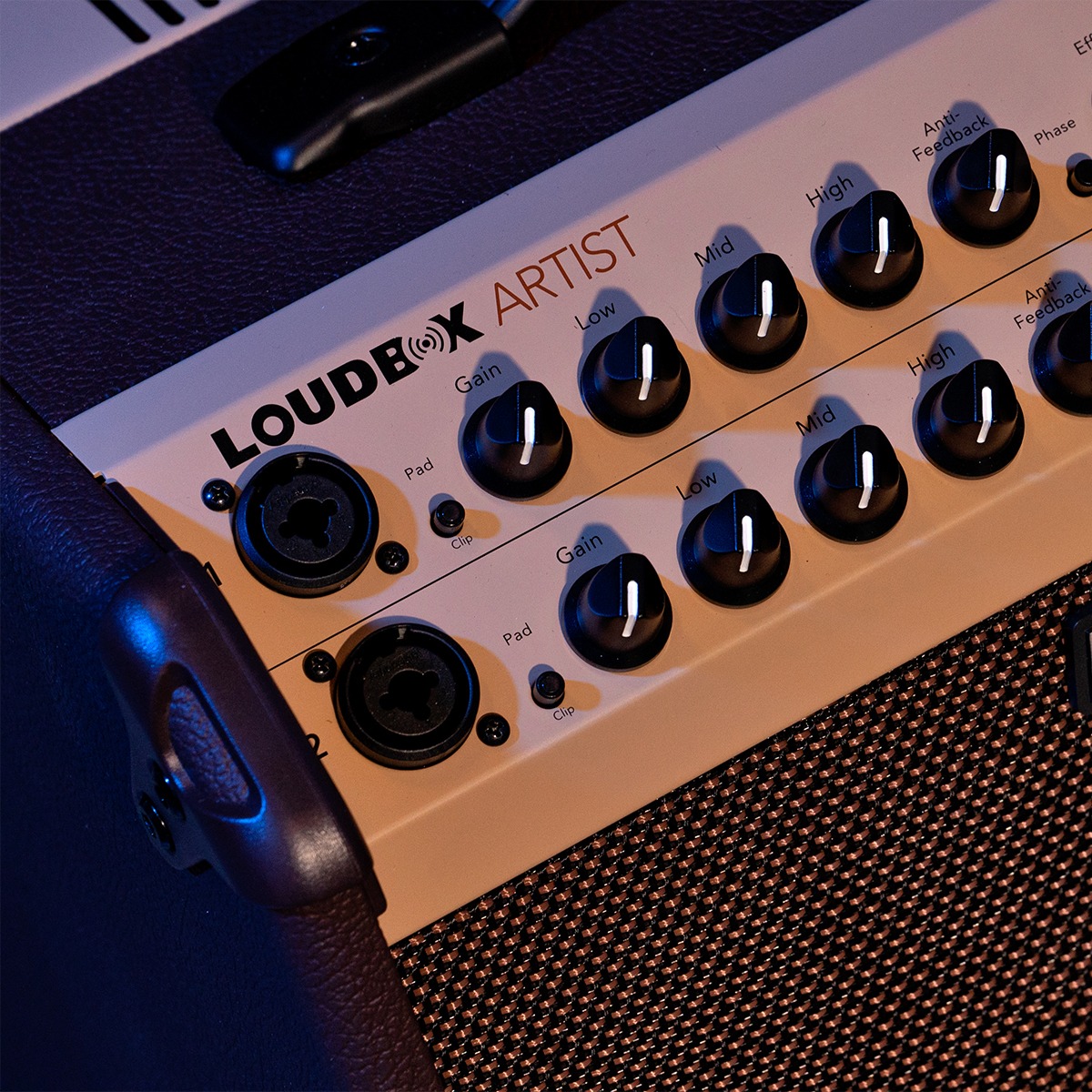 120ワットの出力と高品位ドライバー2基によって、Loudbox Artistは圧倒的なダイナミクスと明瞭さを実現。バンド編成の中でもしっかり存在感を放ち、アコースティックの音色を力強く届けます。