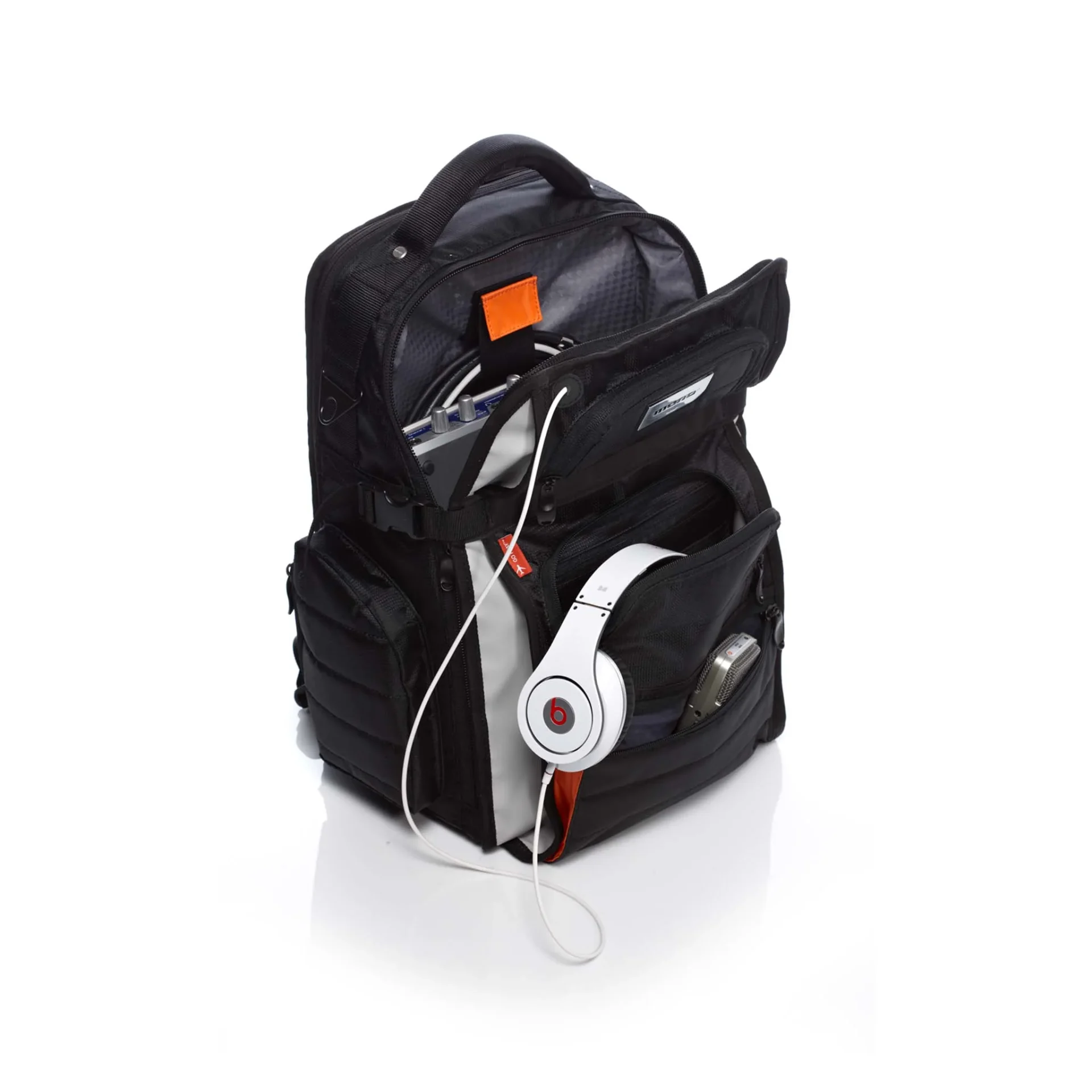 最大17インチのノートパソコンを収納できるほか、少量のレコード、Seratoスタイルのインターフェース機器、コントローラー、ハードドライブ、ヘッドフォン、ケーブルなどを整理して持ち運べます。また、必要に応じて取り外し可能なラップトップバッグをバックパックから分離できるため、状況に応じた柔軟な使い方が可能です。