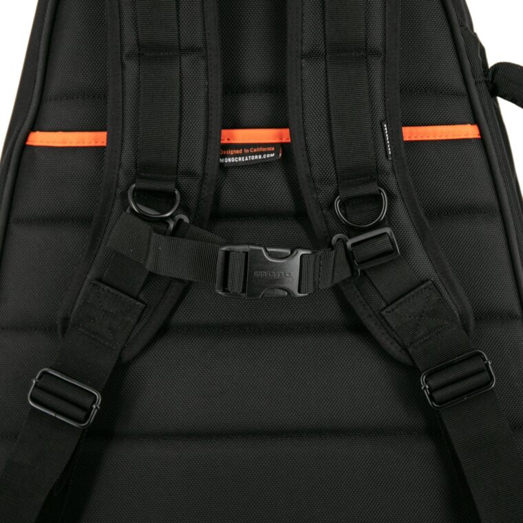 MONO 独自の Headlock® ネック・サスペンション・システムにより、移動中もベースをしっかり固定し、衝撃から保護します。ケース内部には AirTag に対応した隠しポーチを備え、移動時の安心感を高めています。外装には耐久性と耐水性に優れた1680Dバリスティックナイロンを採用し、止水ジッパーと反射材のアクセントを装備。あらゆる環境下で楽器を安全に守る設計です。
