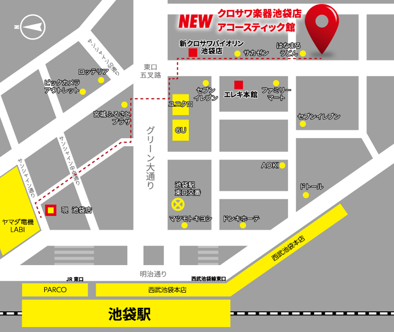 2022年6月18日に現クロサワ楽器池袋店アコースティック館は、現在の場所から移転しリニューアルオープンいたします。