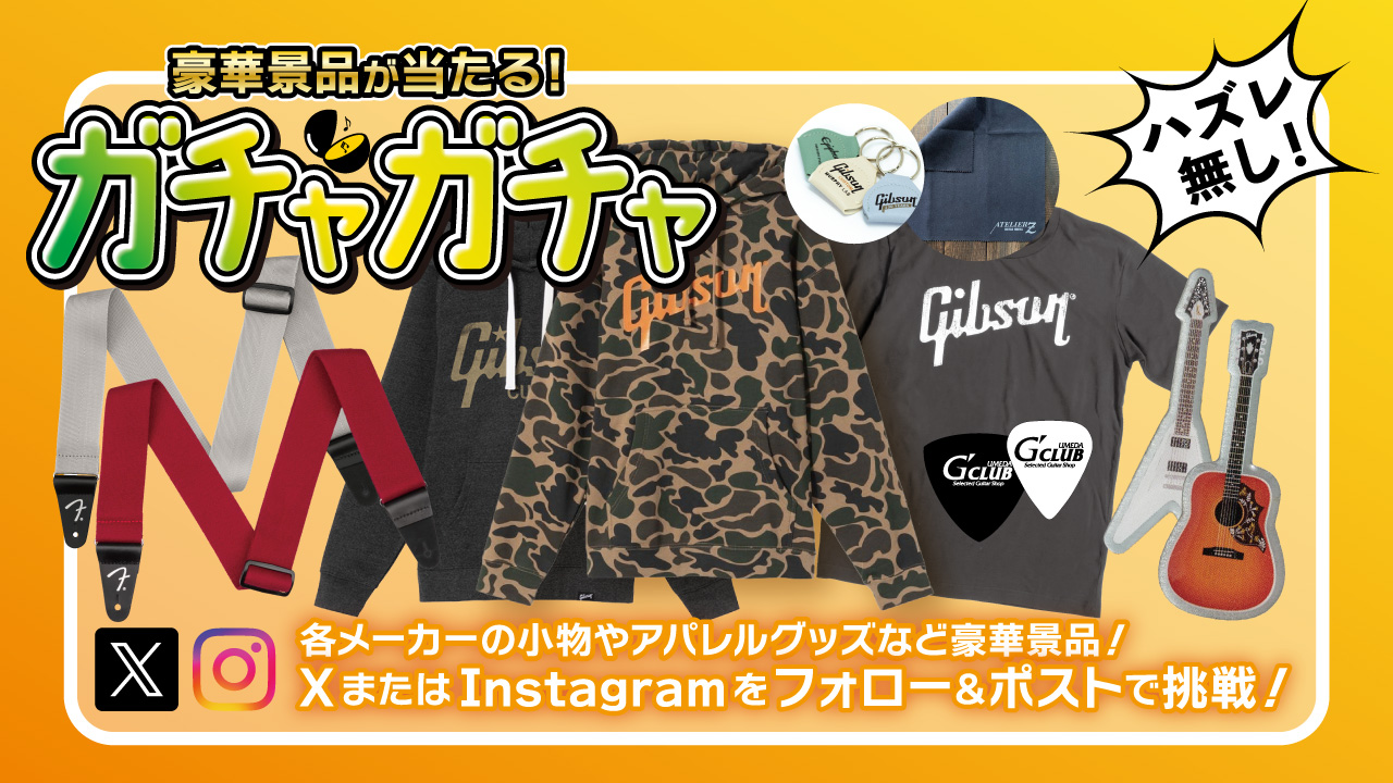 当店のXまたはInstagramをフォローし、投稿をしてくださったお客様に、豪華景品が当たるガチャガチャへのチャレンジ権をプレゼント。ギブソンやフェンダー、アトリエZなど様々なメーカーの小物やアパレルグッズをたくさんご用意しています。