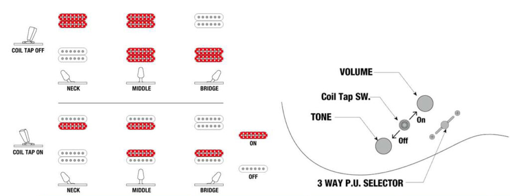 ネック・ポジション及びブリッジ・ポジションのハムバッカー・ピックアップに機能するコイルタップ・スイッチを搭載し、より豊富なサウンド・バリエーションを実現しています。
