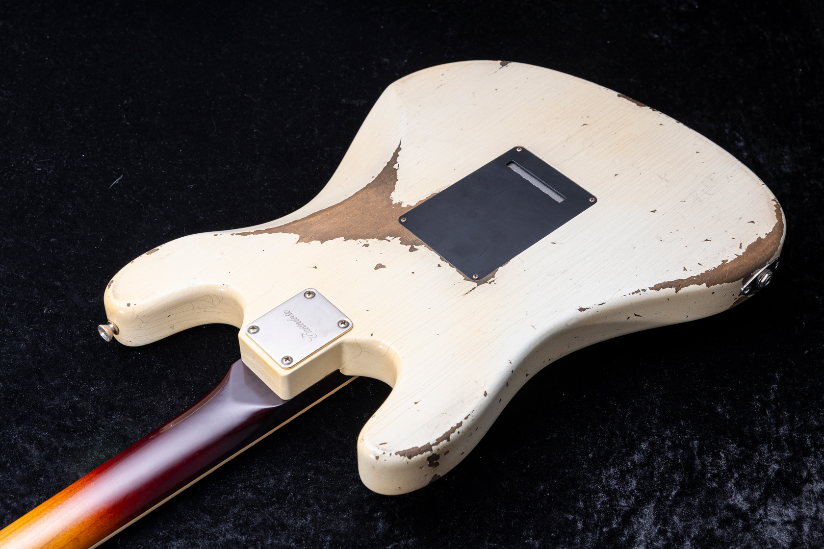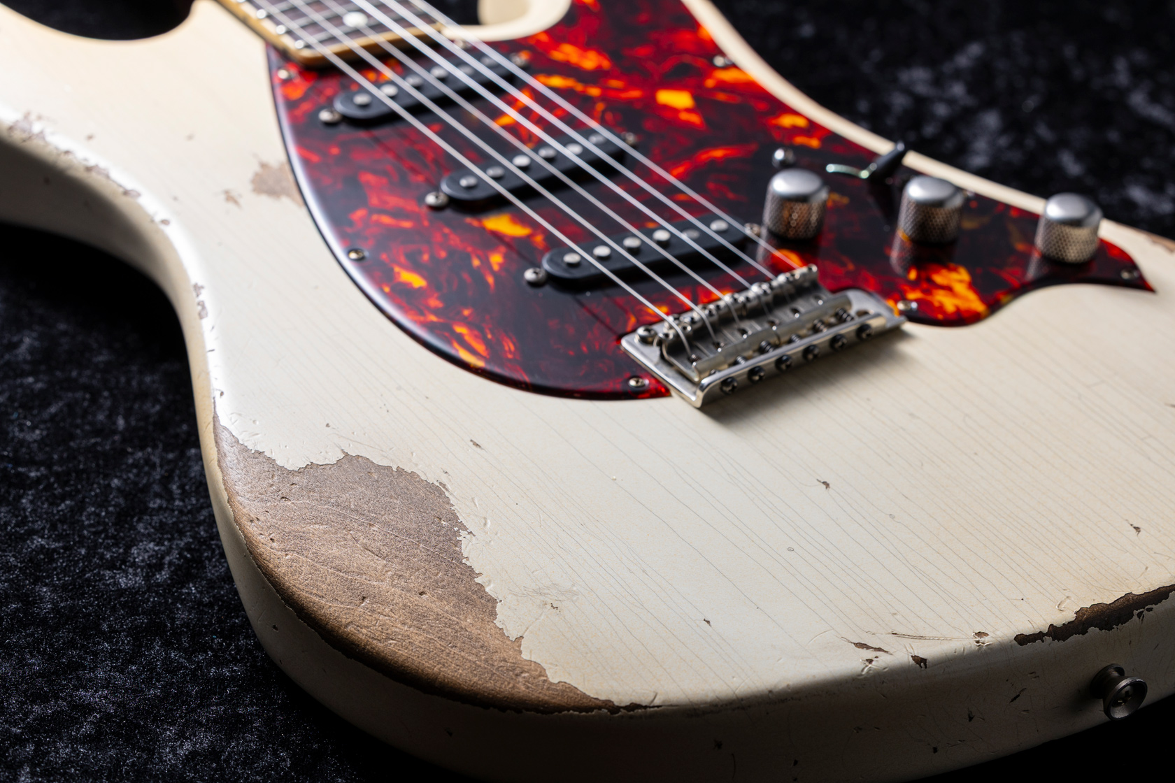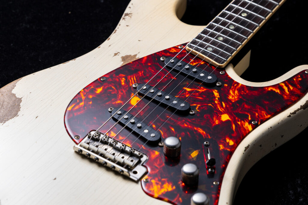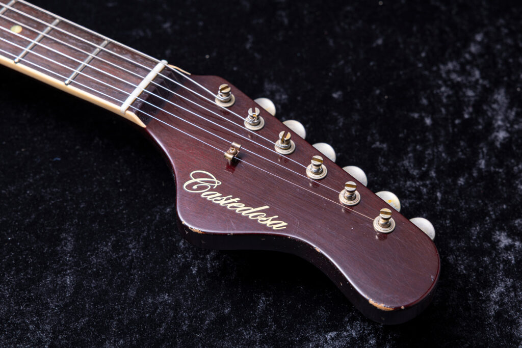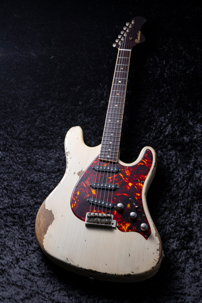 特徴的なヘッドデザインやボディ形状からは、まるで60年代のビザールギターを彷彿とさせるかのような雰囲気が感じられますが、非常に丁寧な組み込みと緻密なエイジング加工によって存在感のあるルックスに仕上がっています。