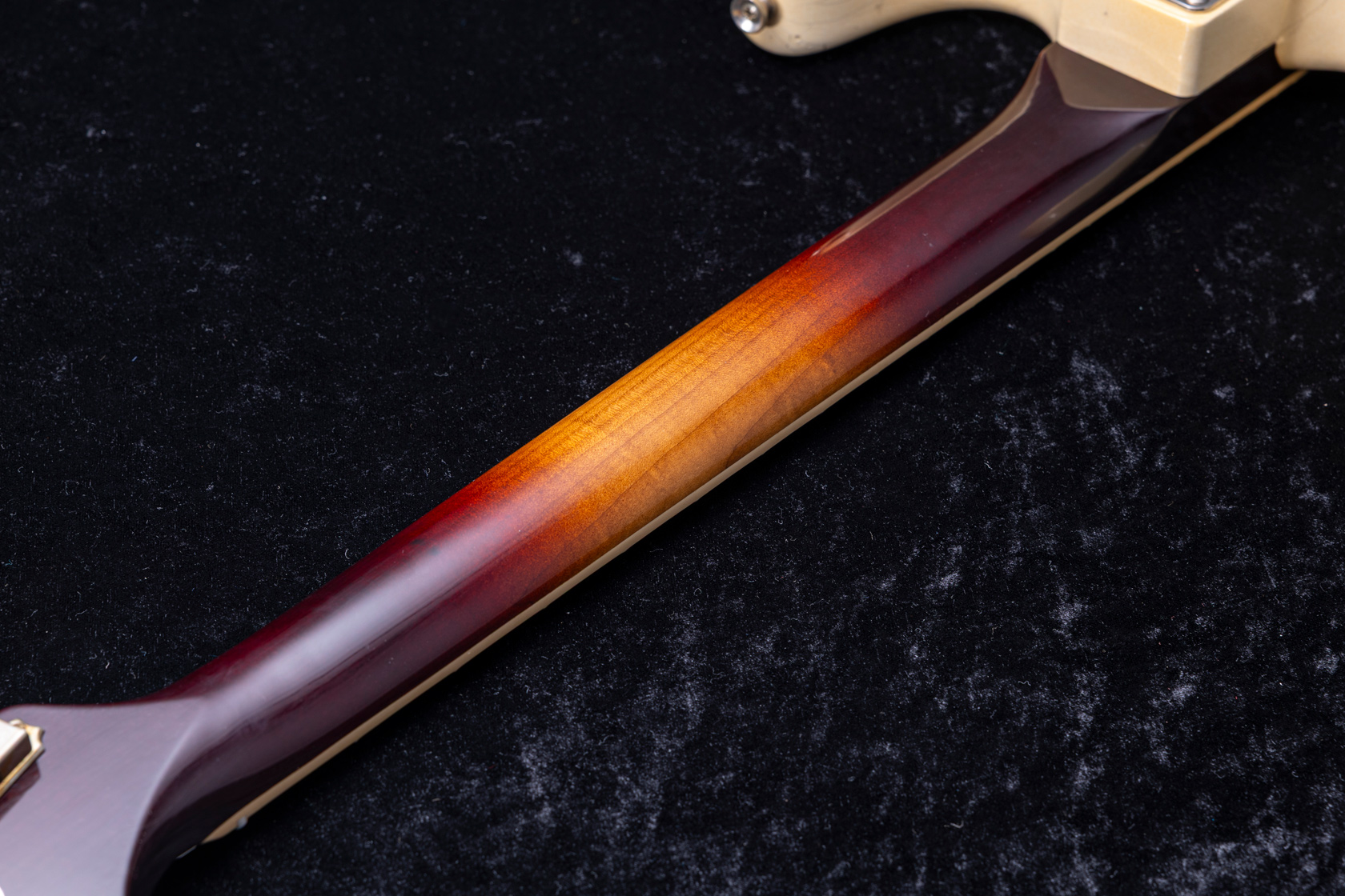 柾目のローストメイプルを採用したバウンドネックは非常にソフトなV形状の厚さのしっかりしたネック(1st .900-12th .930)となっており、厚みがあっても手に馴染むシェイプとなっております。ローズウッド指板も他メーカーでは見ないような目の詰まったものとなっております。