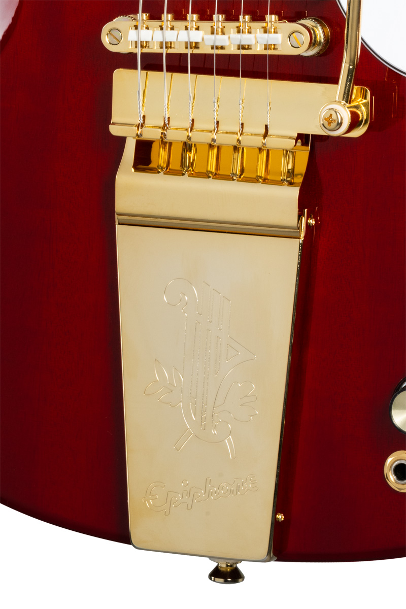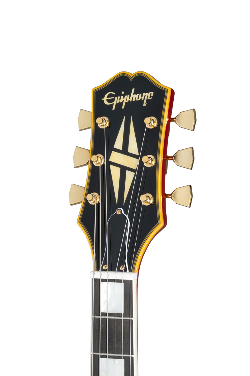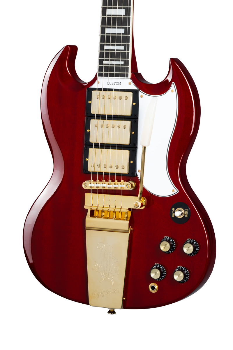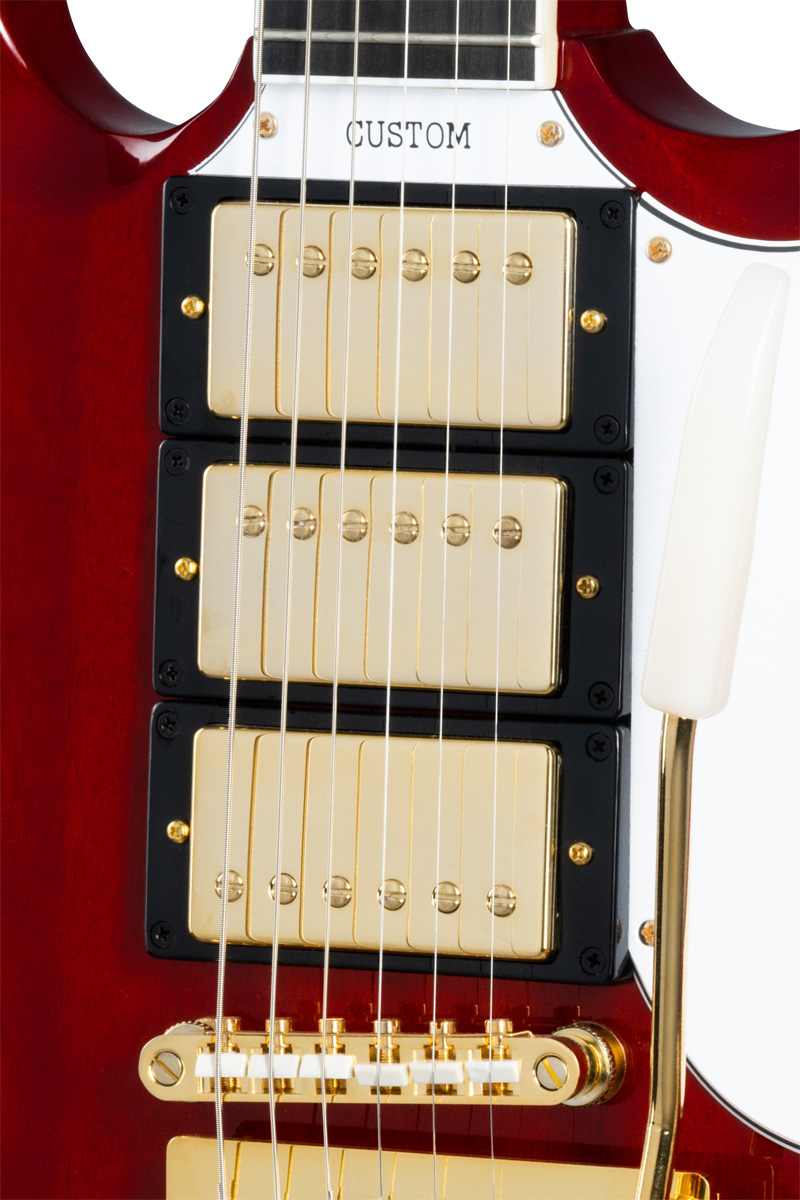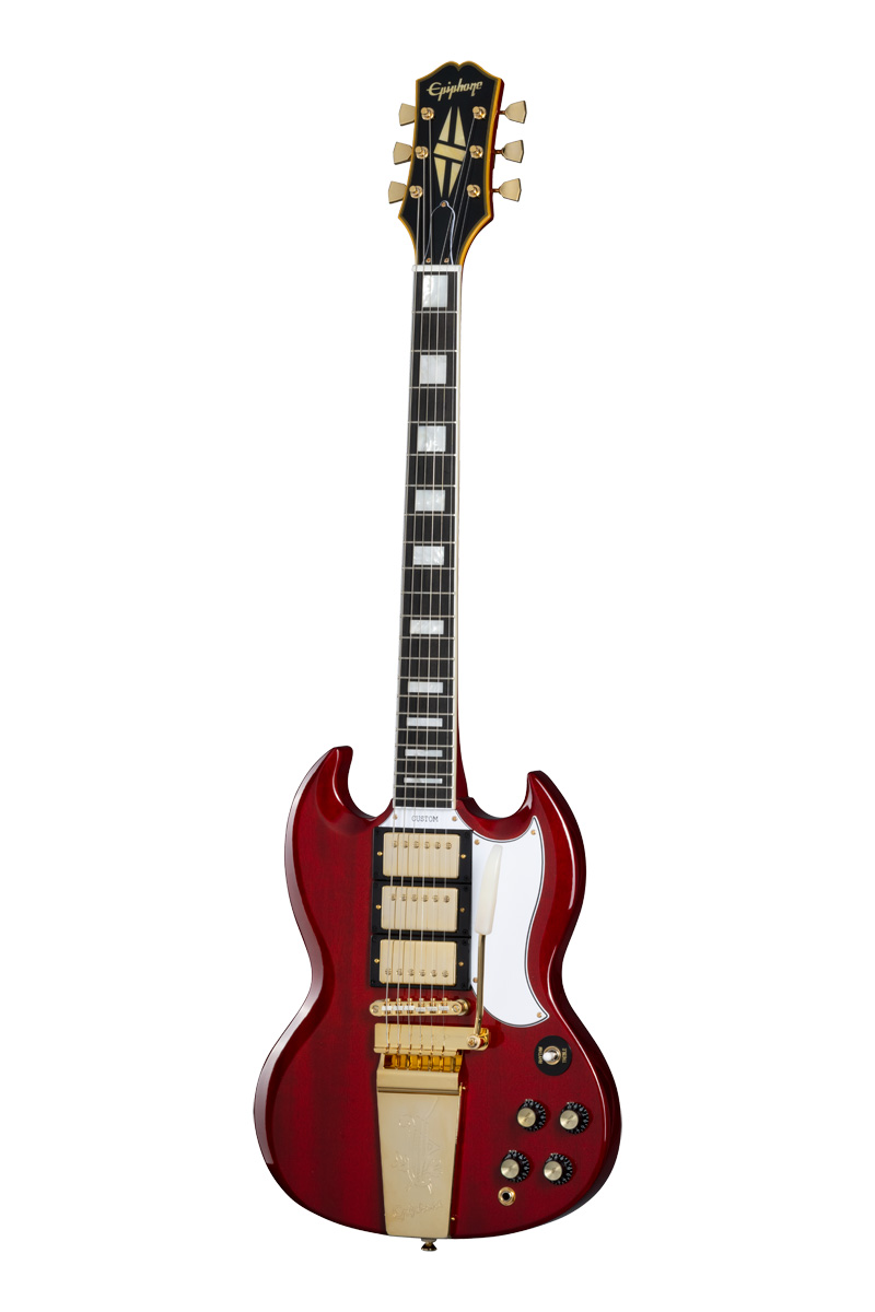 この度リリースされるエピフォンのジョー・ボナマッサ1963 SG Custom は、このユ ニークなモデルの魅力を忠実に再現しています。 ネックジョイント部におけるオリジナル と同様のスムーズなネック形状、Maestro™ Vibrola™、クラシックなSG Custom の意匠、ゴールドメッキの施されたハードウェア、パワフルな Epiphone ProBucker™ピックアップを3 ピックアップ仕様として搭載するなど、充実の仕様内容 を誇ります。アーティスト認定書と特製カスタム・ハードシェルケースが付属となります。