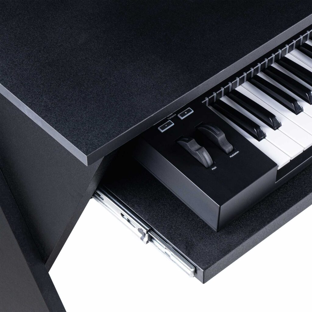 3段のステージに分かれており、メインパネルは幅と奥行きともに余裕があり、機材を配置するスペースが十分に確保されています。奥側の左右には2つの3Uラックスペースがあり、コンプレッサーやイコライザー、エフェクトなどの19インチ機材をマウントすることができます。中央にはオーディオインターフェースなどの収納に適したスペースも用意。引き出し部分は88鍵のキーボードが収納できます。また、引き出しの高さは6段階で取り付けが可能です。