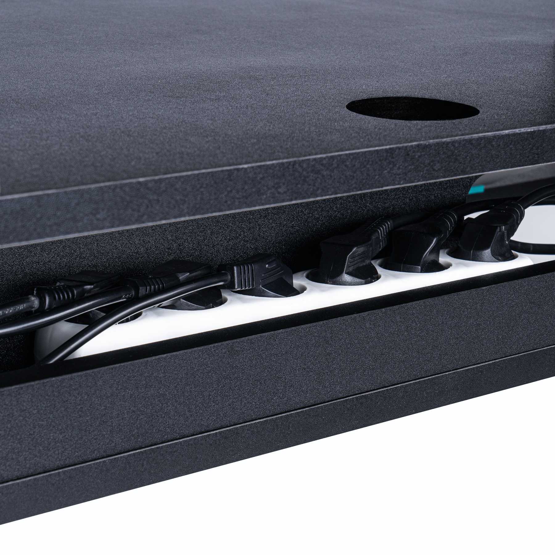 ケーブル配線用のダクト穴を多数設けた構造になっています。中央奥のケーブルダクトは、複数の電源ケーブルの整理に適しており、テーブルの手前と背面の両側からアクセスできます。高さのある上部の板はケーブルを通すためのくぼみがある形状となっているため、壁にぴったりと付けて設置することが可能です。