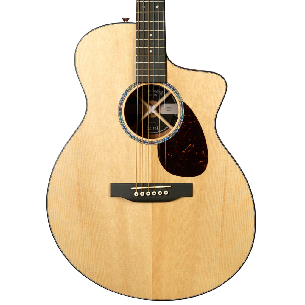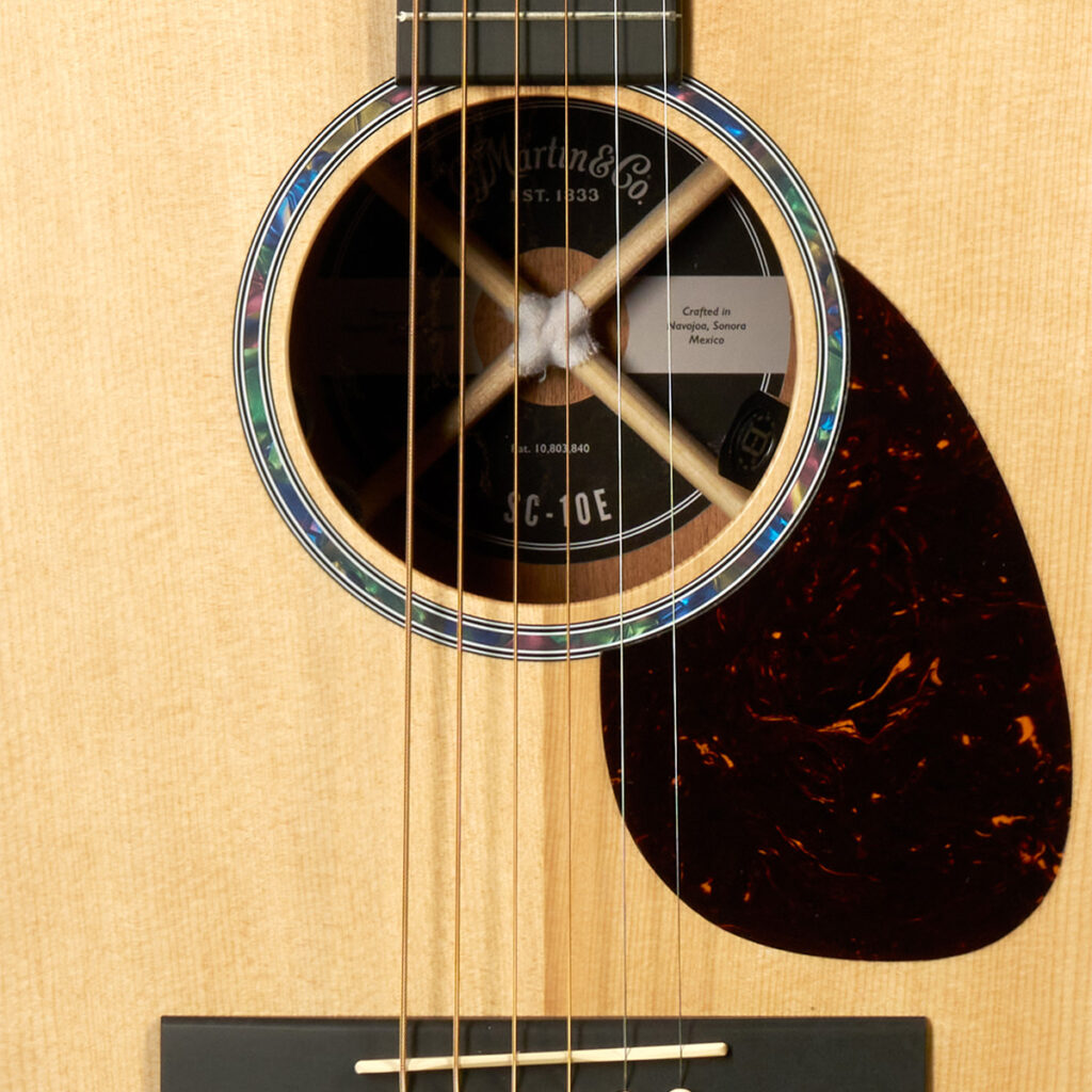 革新的なボディシェイプとして登場したSCシリーズ、SC-10Eのスプルーストップ仕様。演奏性を最大限に引き出すために設計され、マーティン独自の特許技術Sure Align®ネックシステム を採用し、全フレットへの自由なアクセスを実現。さらに Low Profile Velocity ネックシェイプ により、スピーディで自然な弾き心地を提供します。、サテンフィニッシュ、ブラックバインディング、アバロン調のシングルリング・ロゼッタ等シンプルかつ洗練されたルックスに指板とブリッジには FSCR認証のリッチライト(Richlite®)を採用し、滑らかな演奏性と耐久性を実現。Martin E1エレクトロニクス搭載のエレアコでボリューム、トーン、位相のコントロールに加え、内蔵クロマチックチューナーにより素早く静かなチューニングが可能です。