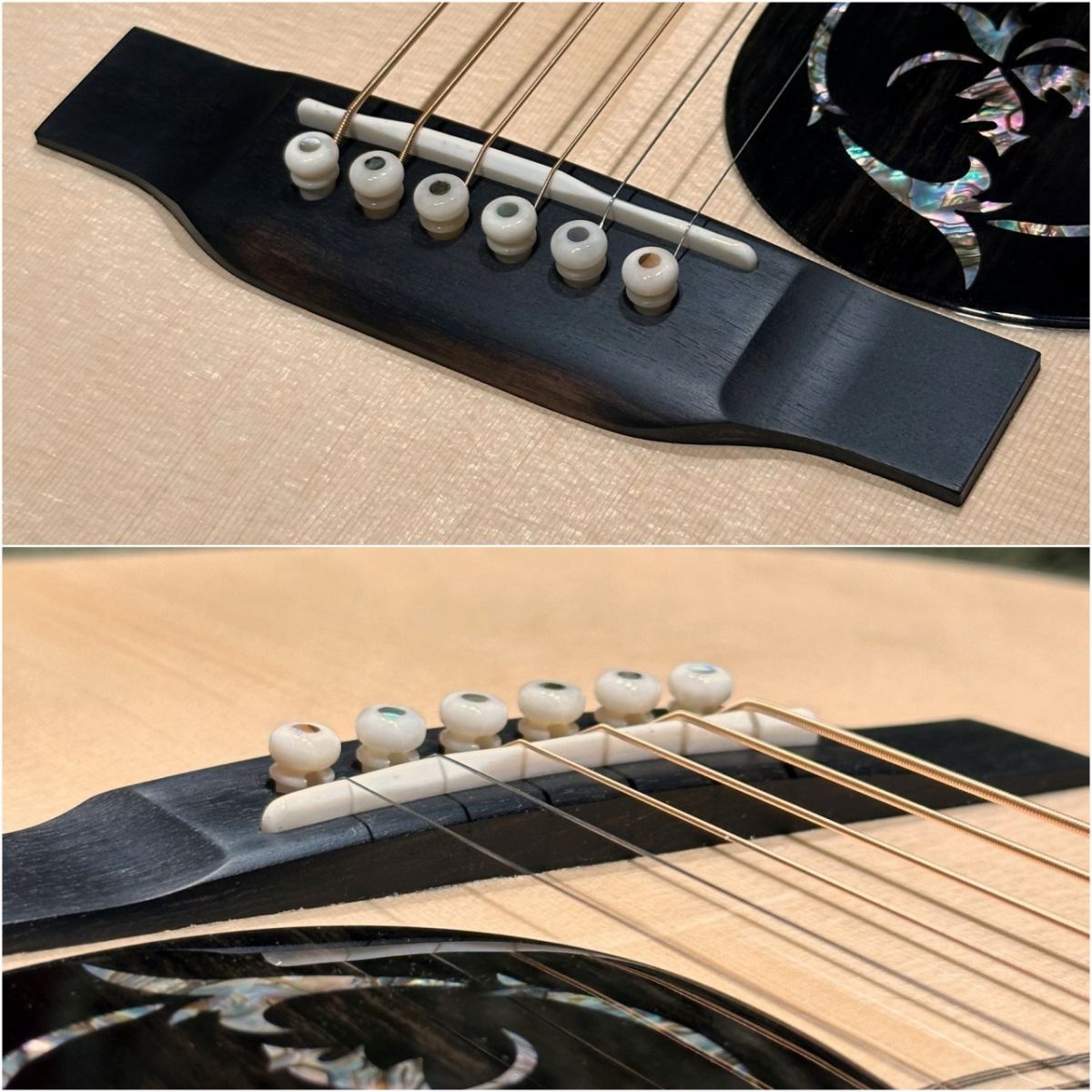 今回の依頼が初めての仕様でブラックエボニーから当個体様に特別に製作いただき、艶やかさと杢の存在感、エボニーのヒビ割れとインレイの貝抜け防止でピックガードは塗り込みにしてあります。