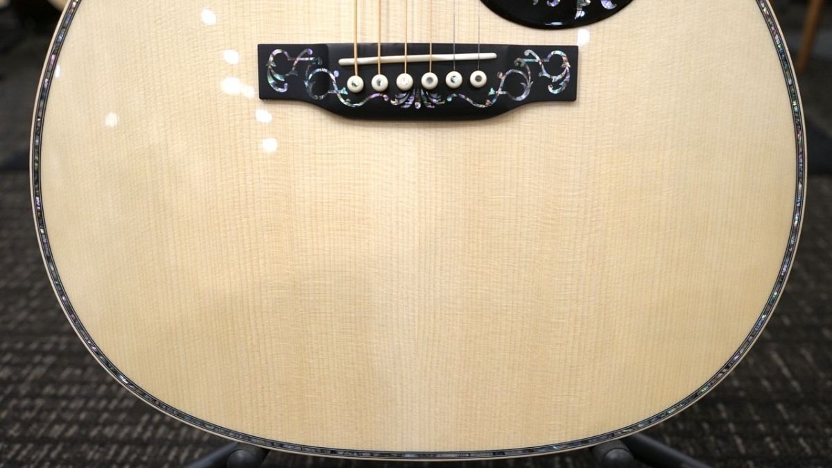 トップはクリアカラーのアディロンダックプレミアムを使用、それを縁取るメイプルバインディング。