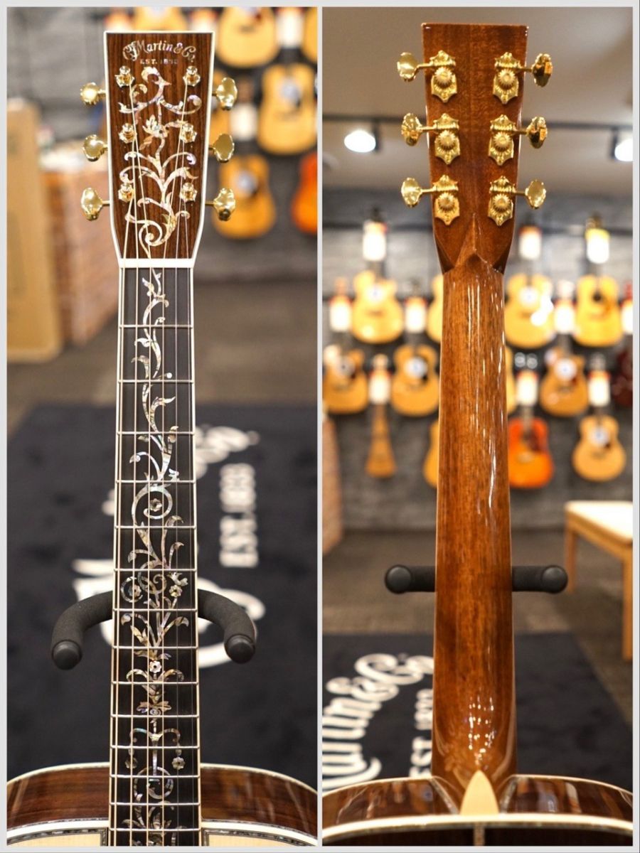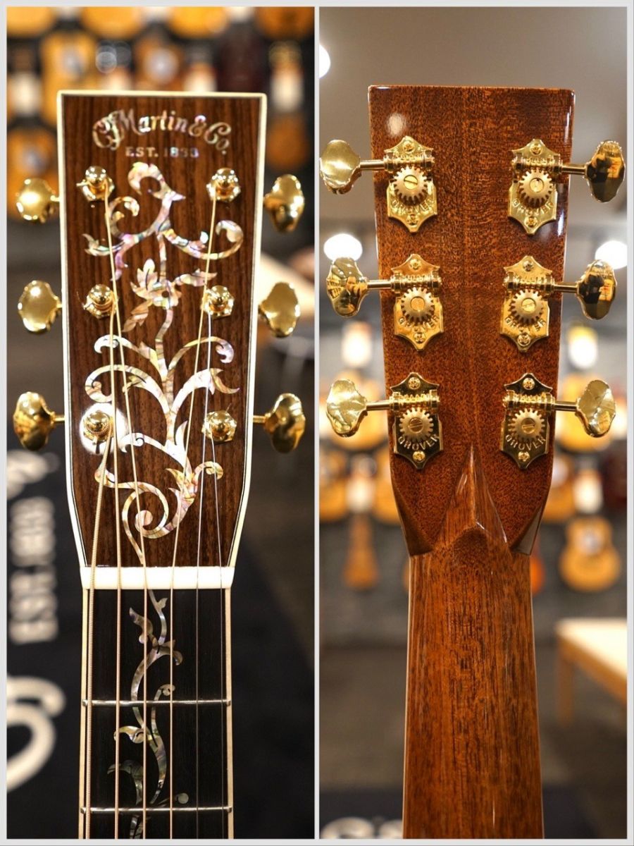 ツリーオブライフのインレイが美しく、その上部にMartinのロゴもアバロンインレイでしっかり刻印されています。