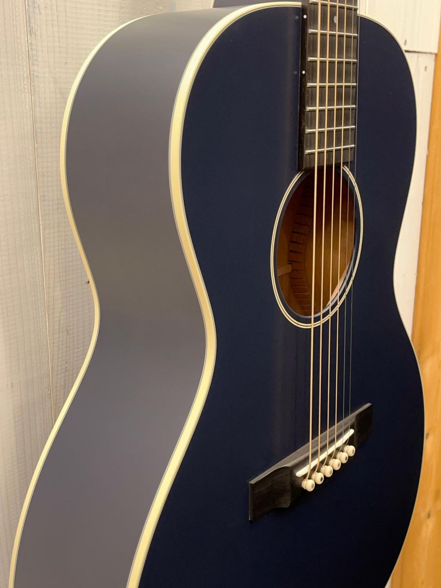 ロゼッタやパーフリング、インレイデザインは極力シンプルな構成ですが、サテンフィニッシュのNavy Blueカラーのボディにヘッドのホワイトバーチカルロゴがなんともスタイリッシュ。