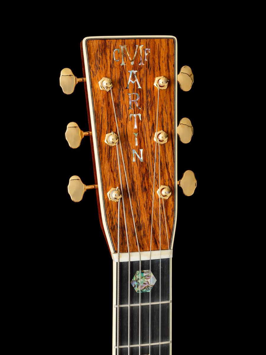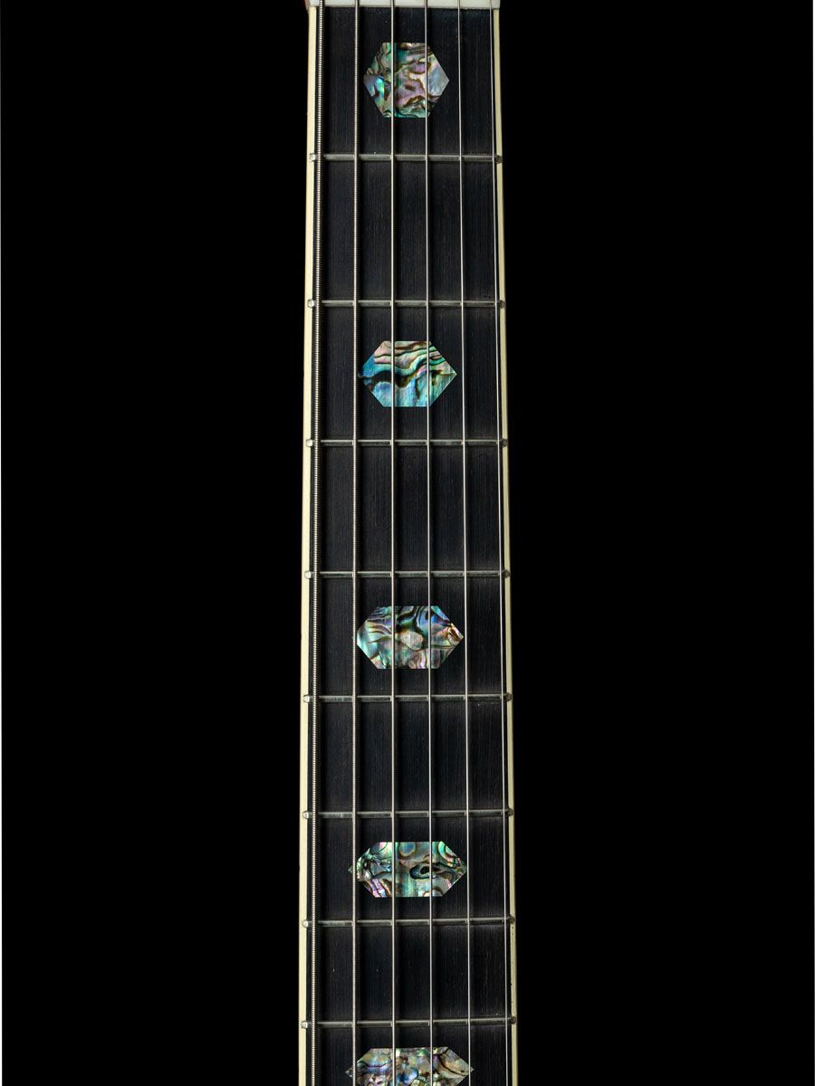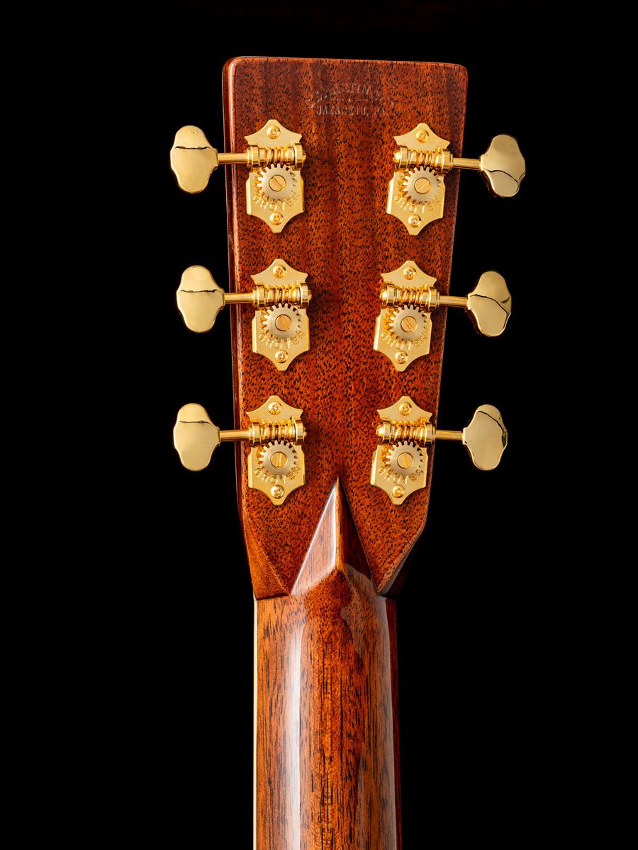 トップにプレミアムグレードアディロンダックスプルース、サイド&バックにグアテマランローズウッドを使用、セレクトアバロンヘキサゴンフィンガーボードインレイ、ゴールデンエラスタイルバーチカルヘッドロゴ、フォワードシフテッドスキャロップドブレーシング(アディロンダックブレーシング)、