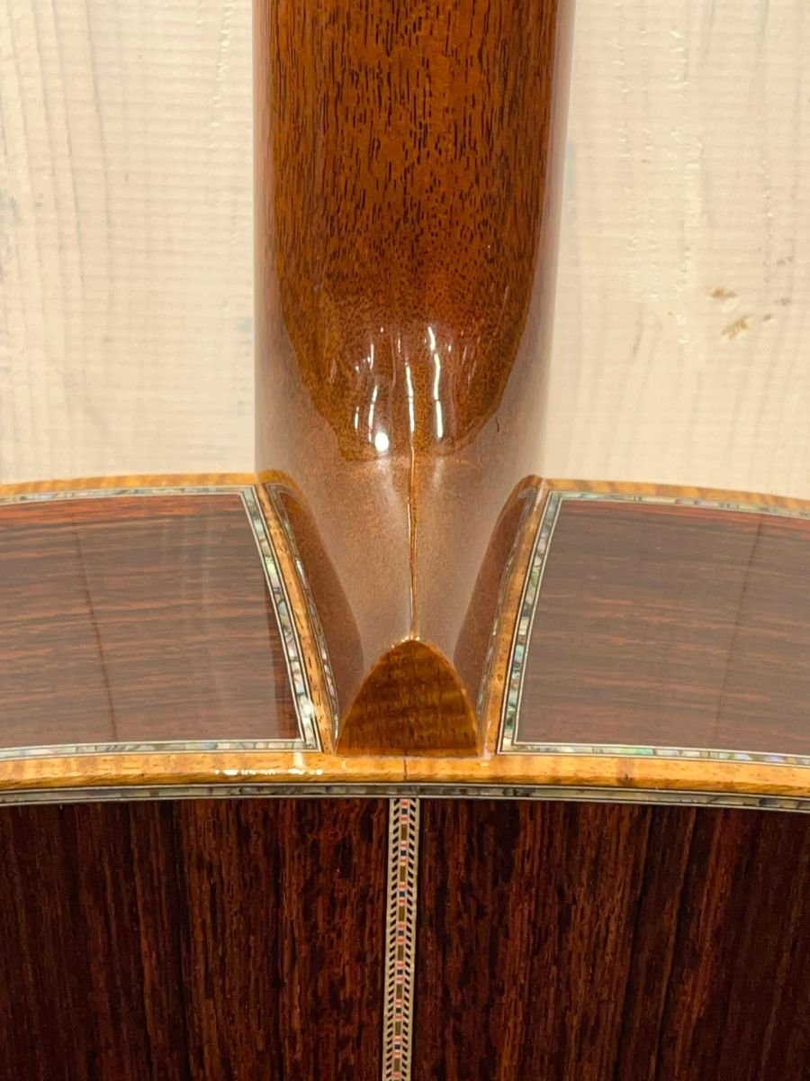 ブリッジのスノーフレイクインレイ、トップ材はオリジナル同様のプレミアムグレードアディロンダックスプルースをセレクト、サイド&バックはプレミアムグレードのイーストインディアンローズウッドをセレクト、オリジナルの気品溢れる佇まいと重厚でいて煌びやか、そして力強いサウンドを再現しました。