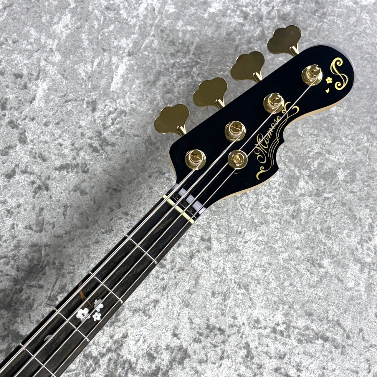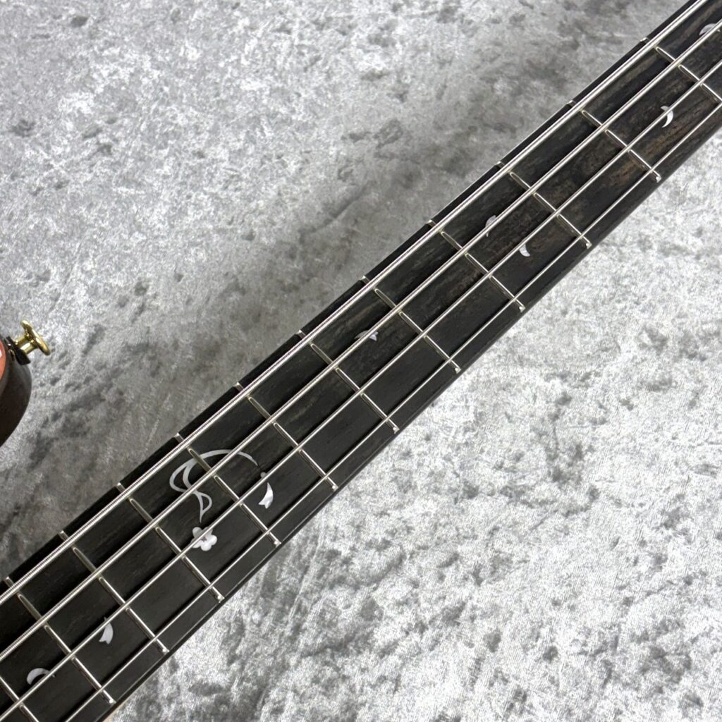 黒の深さが高級感を引き立てるエボニー指板には、桜の花びらを形どるインレイが呼吸をしています。これもまたディバイザーにしか成し得ない技術であり、楽器を単なる道具で終わらせない、そこに美しさを求める日本の高い芸術性を感じます。