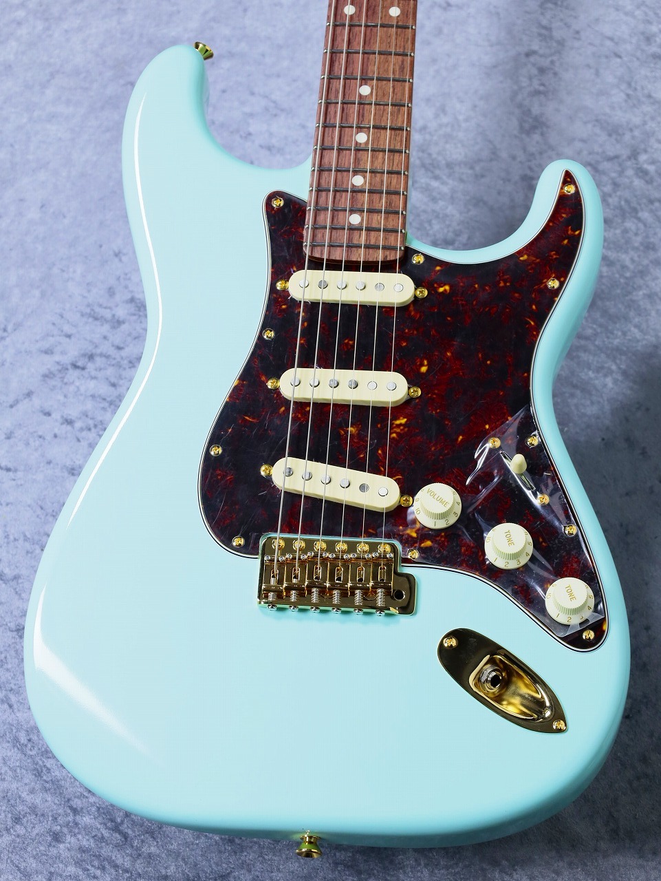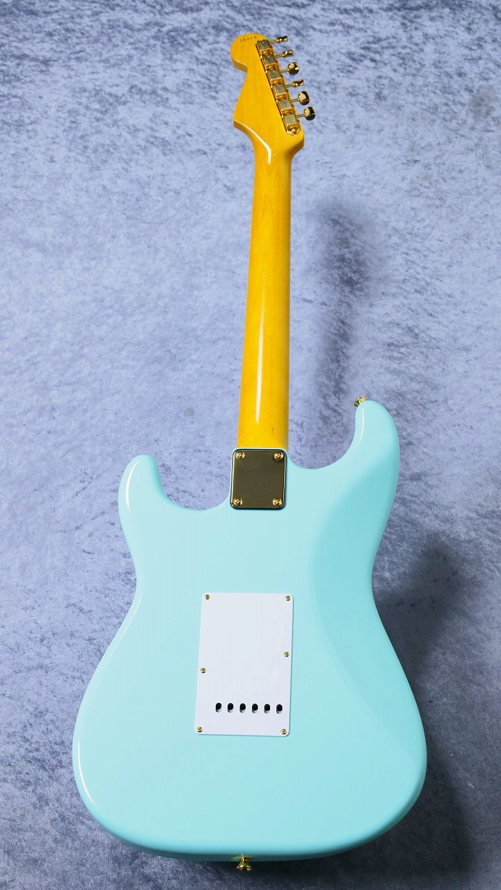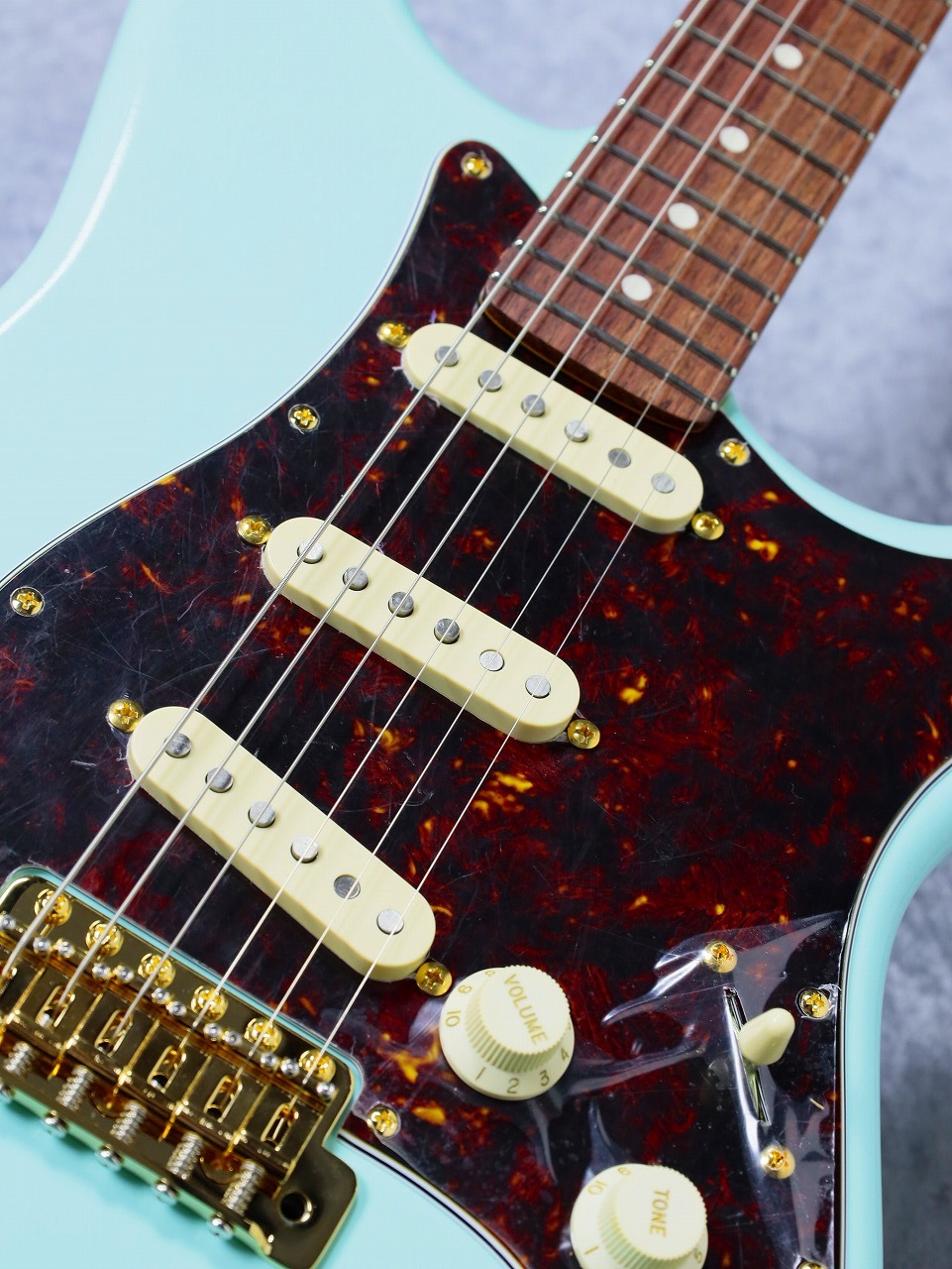 明るくて、再度の高いサーフグリーンを基調としており、非常にかわいいカラーリングです!あえてべっ甲柄のピックガードと組み合わせており、まるでチョコミントのような仕上がり。部屋に置いておくだけで気持ちも明るくなる、舞台映えする1本ですよ。更にはゴールドパーツでおり華やかな印象です。