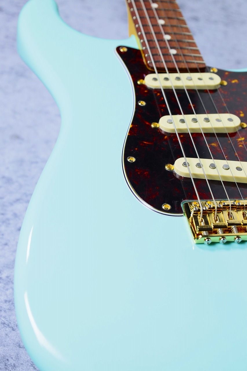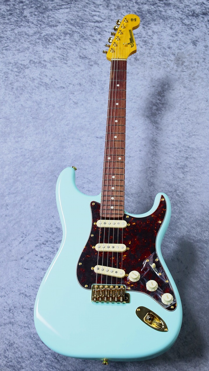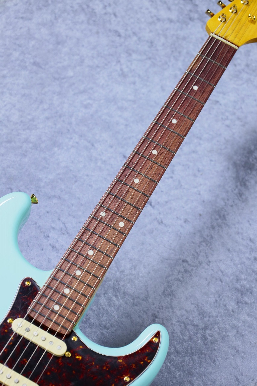 明るくて、再度の高いサーフグリーンを基調としており、非常にかわいいカラーリングです!あえてべっ甲柄のピックガードと組み合わせており、まるでチョコミントのような仕上がり。部屋に置いておくだけで気持ちも明るくなる、舞台映えする1本ですよ。更にはゴールドパーツでおり華やかな印象です。