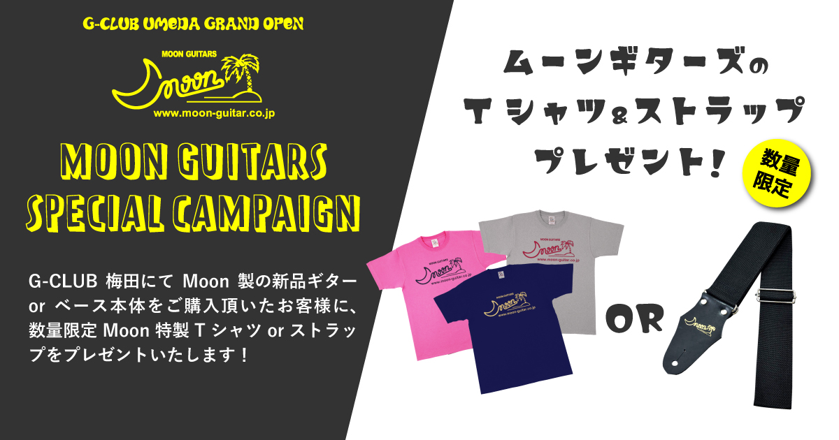 G-CLUB UMEDAにてにてMOON GUITARS製の新品ギターorベース本体をご購入頂いたお客様に、ムーンギターズ特製Tシャツorストラップをプレゼントいたします!
