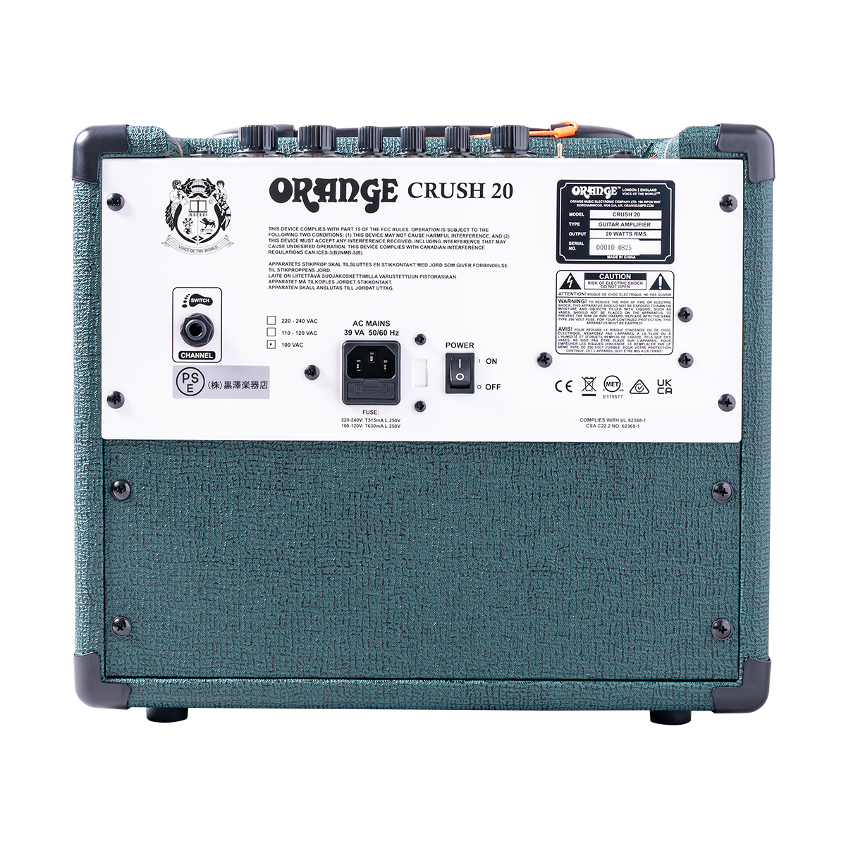 ツインチャンネル仕様のCrush 20は、ギタートーンに対して一切の妥協を許さず、コンパクトで持ち運びに優れたパッケージにその機能を収めました。フットスイッチ対応のクリーンチャンネルとダーティチャンネルを備えた新しいハイゲイン仕様の4ステージ・プリアンプデザインにより、倍音豊かな多彩なオーバードライブサウンドとディストーションサウンドを生み出します。Crush 20のカスタム8インチ「Voice of the World」スピーカーが生み出す圧倒的なパンチ力は、コンパクトなサイズからは想像もできないほどの迫力を誇ります。バックトラック用のAux In端子やCabSim搭載のヘッドフォン出力を備え、伝説的な「Orangeサウンド」を手軽に楽しめる練習用アンプとして最適な選択肢となっています。