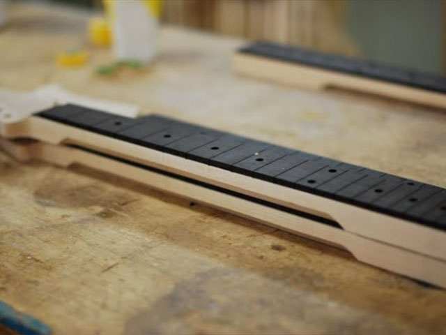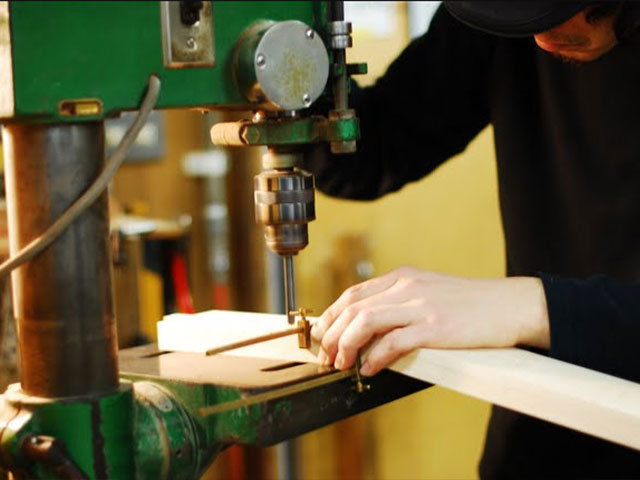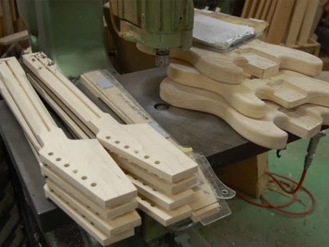 | ネックを切り出し | ボール盤での穴あけ | 耳はり | トラスロッド穴開け | PC上でCADデータを | CNC加工 |