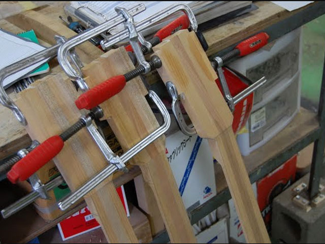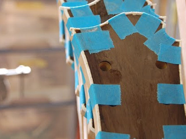 | メイプルの埋木接着 | 接着剤の癒着を防ぐ | 狂いにくいネック | ボディ材の接着 | トップ材接着後 | ドロップトップ |