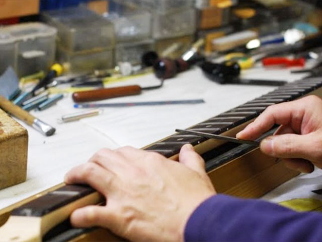 | フレットすり合わせ | フレット磨き艶出し | ボリューム穴開け | ベストな配線を | セットアップ | 命が吹き込まれる |