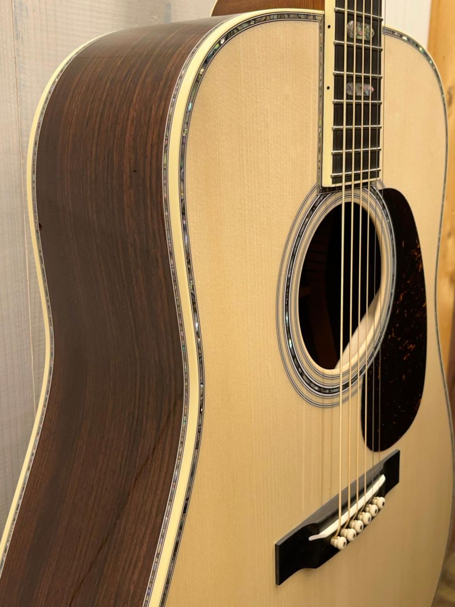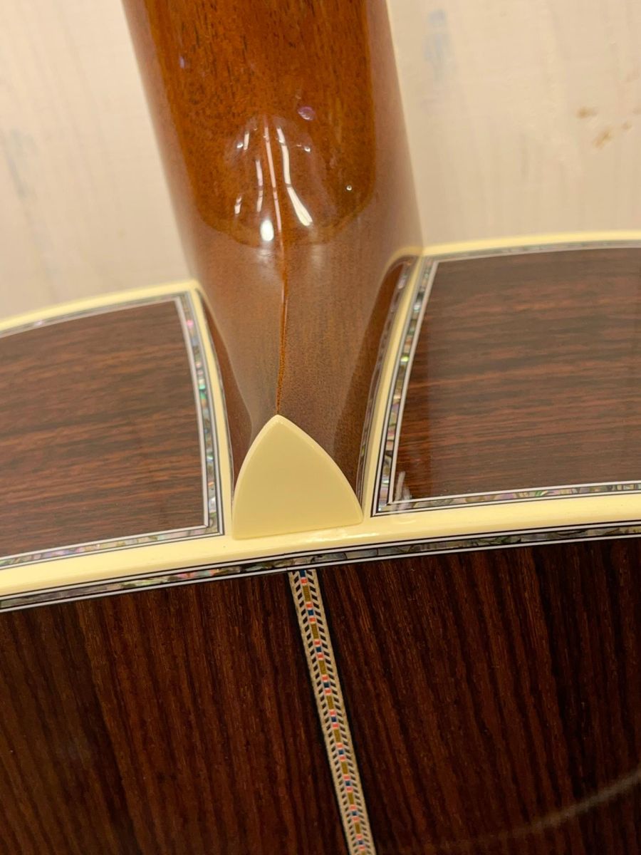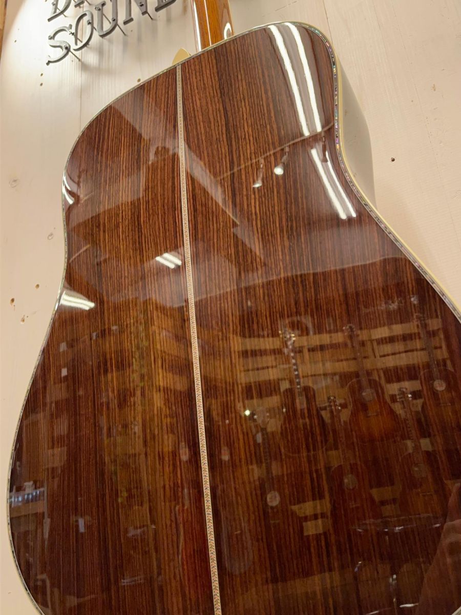 トップにプレミアムグレードアディロンダックスプルース、サイド&バックにプレミアムグレードイーストインディアンローズウッドを使用、ヘキサゴンフィンガーボードインレイ、マザーオブパールバーチカルヘッドロゴ、べっ甲柄ヘッドプレート、ヴィンテージスタイルカバードグローバーチューナー、ロングサドル、ゴールデンエラブレーシング(アディロンダックスプルース)、1930 Styleシェイプネック、42.9mmナット幅、プリウォー期の人気の高いスペックを取り入れ、ルックス、サウンド、演奏性を追求したカスタムD-45!