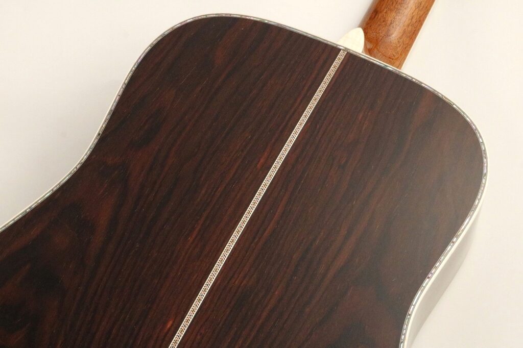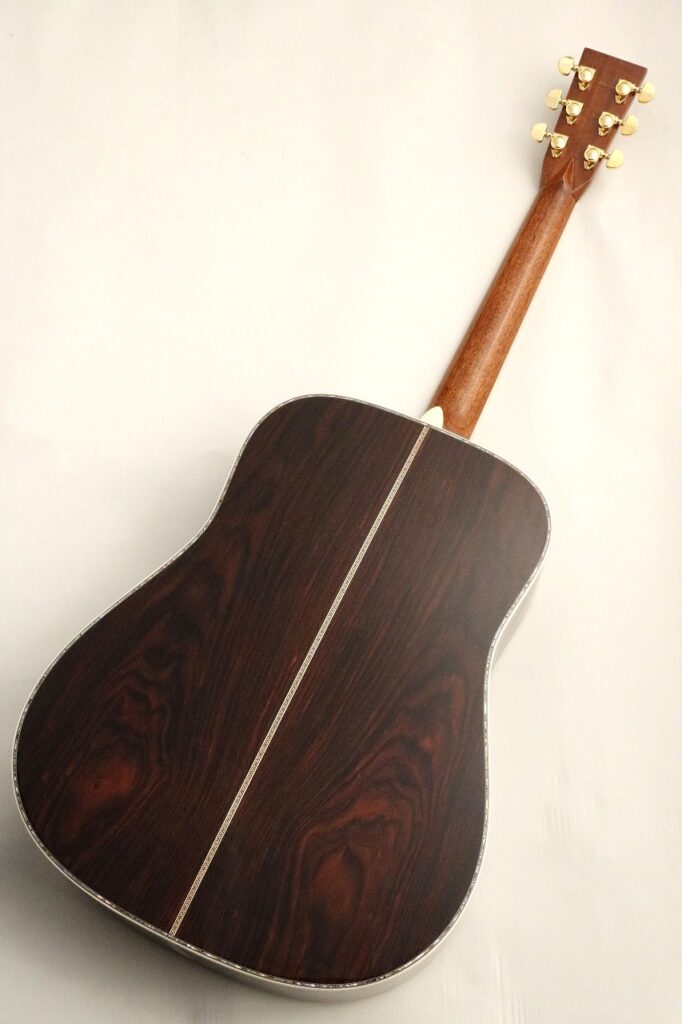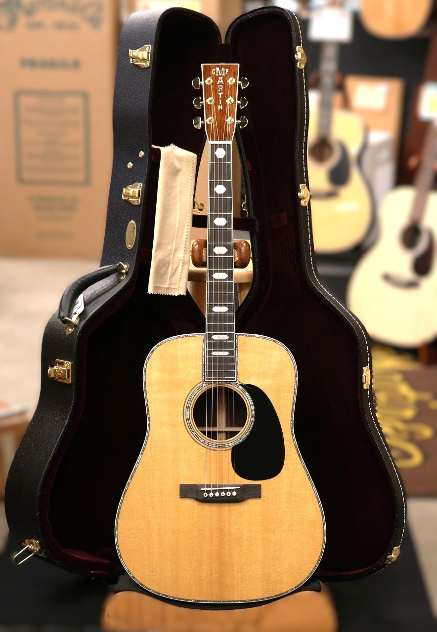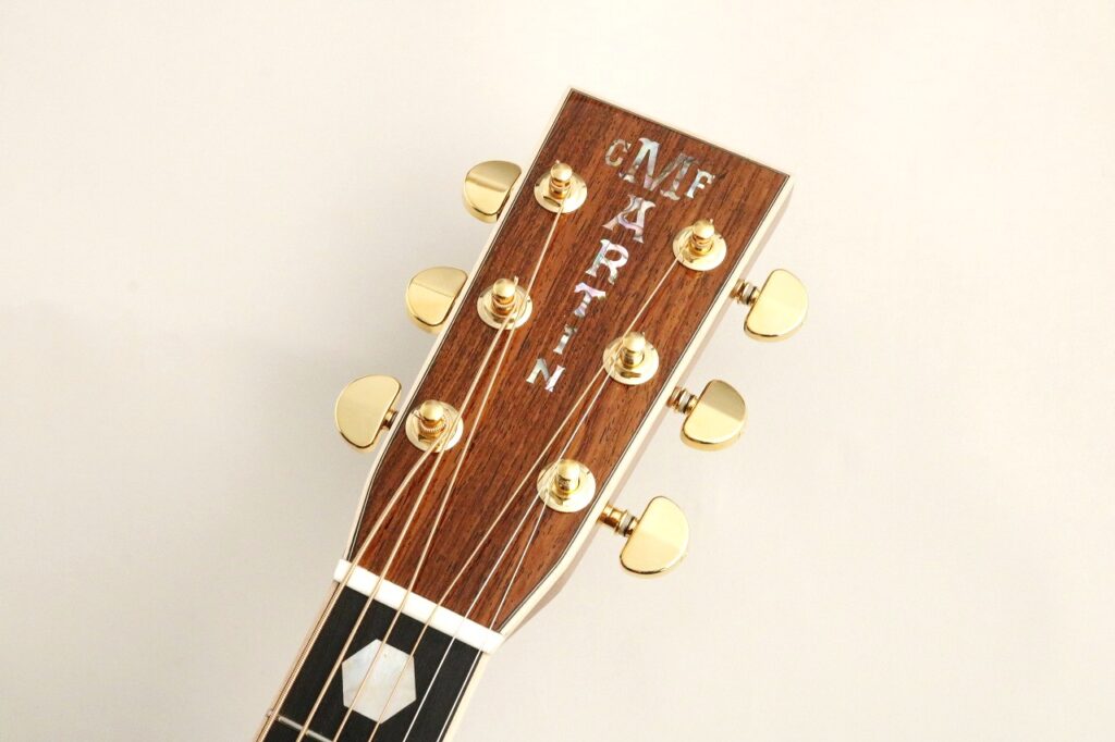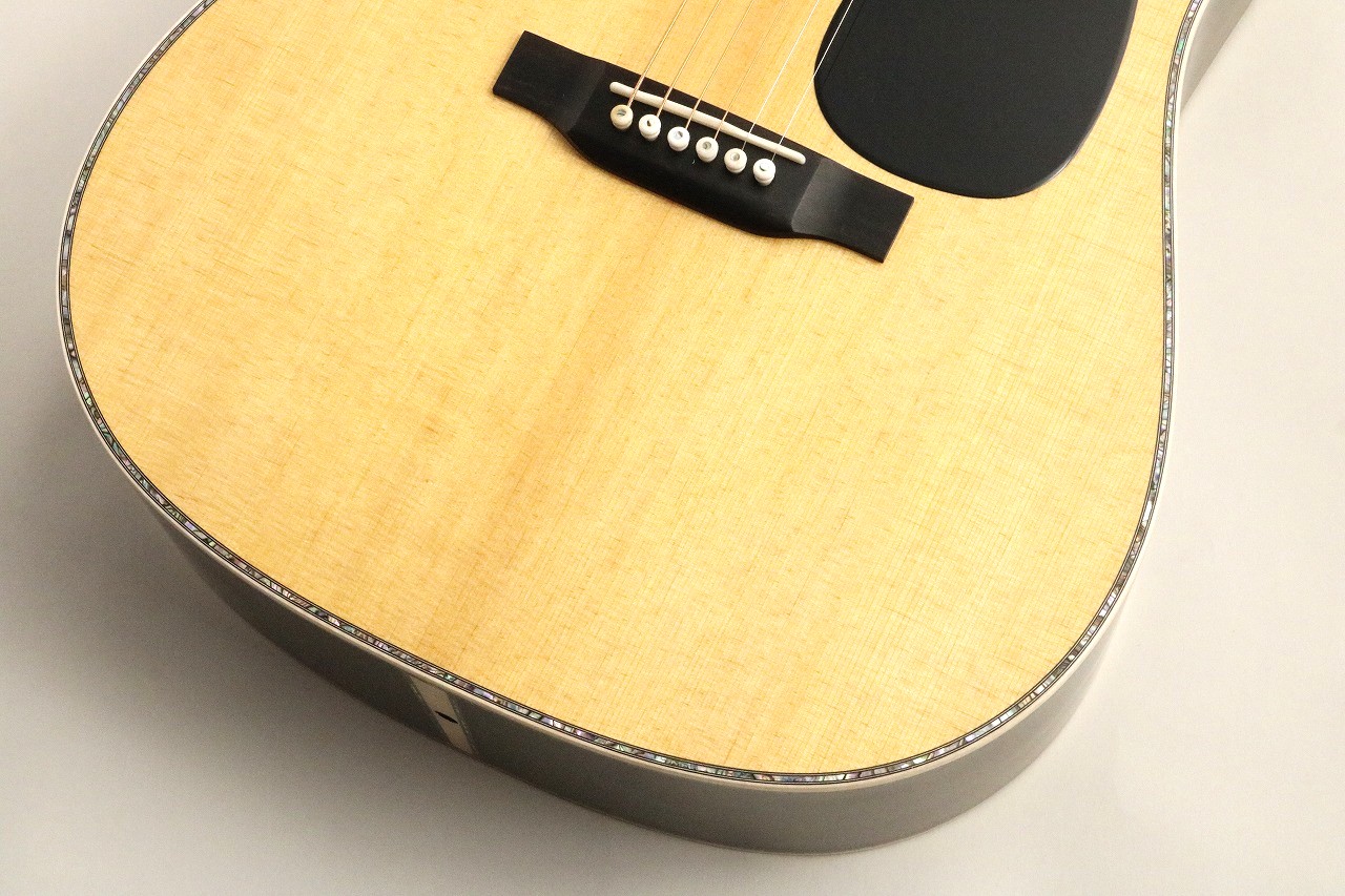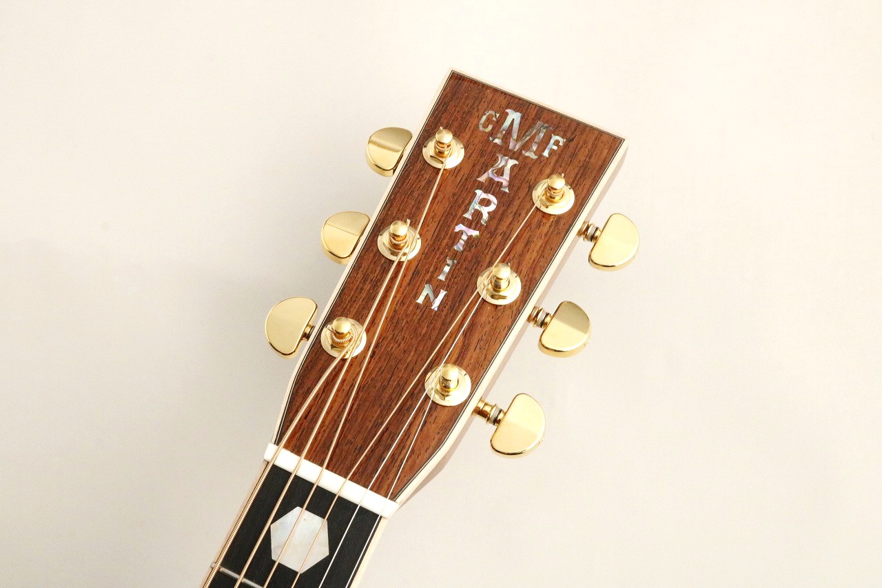 渋谷で好評を頂いているメイプルバインディングとLow Profile の細め且つ丸いネック、さらに鋭角なスクエアヘッドのD-45と併せて、1968年、69年の仕様をまぜ込んだ渋谷オリジナルオーダー品。本来68、69年はヘッドの角が丸まったラウンドヘッドが特徴ではありますが今回ご紹介するこの個体は近年仕様の鋭角スクエアヘッドを採用。ゴールドのクローズドタイプのグローバーペグとグアテマラローズの化粧板、Martinの縦ロゴと併せてヘッドだけ見ても魅力的なものに仕上がっています。トップにはVTS加工が施されたプレミアムグレードのシトカスプルースに色味のついたAigingTonerの塗装、サイド・バックにも色味が濃く木目の美しいプレミアムグレードのグアテマラローズウッドを使用しています。ヘッド化粧板にも同じくプレミアムグレードのグアテマラローズ、ペグにはゴールドのクローズドタイプGroverペグ、ナット幅は約42.9mmの細めのナット幅にかまぼこ型のLow Profikeネックシェイプ。指板インレイは白く輝くマザーオブパールのヘキサゴンインレイ、ピックガードは艶ありブラックピックガードを採用しており随所において68年製を意識した仕様がちりばめられた仕様になっています。サウンドは豪華絢爛迫力満載といったワンストロークで圧倒される響き。近年Martinの広がりがあり空間を優しく覆いつくすような煌びやかなサウンドの中に、68年付近の響きの特徴でもあるゴツっとした太さと力強さが感じられ、低音から高音まで分離が良く響きの細部が鮮明に耳に届く印象。さらにボディ全体の鳴りと伝達の精度の高さからか、体から伝わる響きの振動も大きい印象があります。外観もサウンドも存在感の強い一本。いつものコードストロークがまた一段と美しくなるようなおすすめの一本です。ぜひこの機会にお手に取ってみてください!