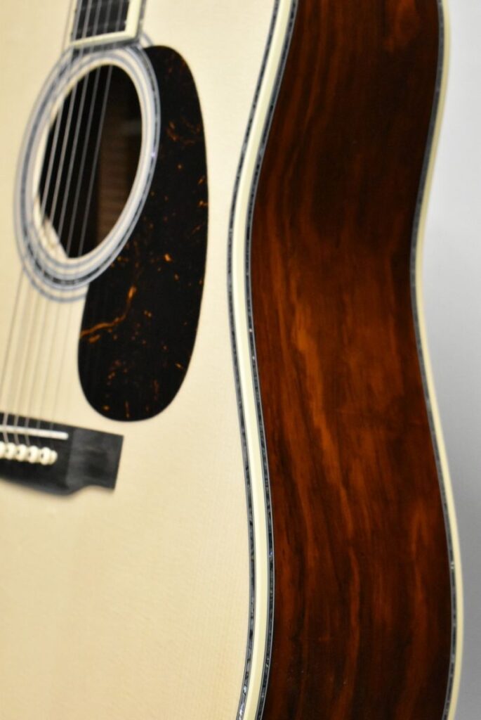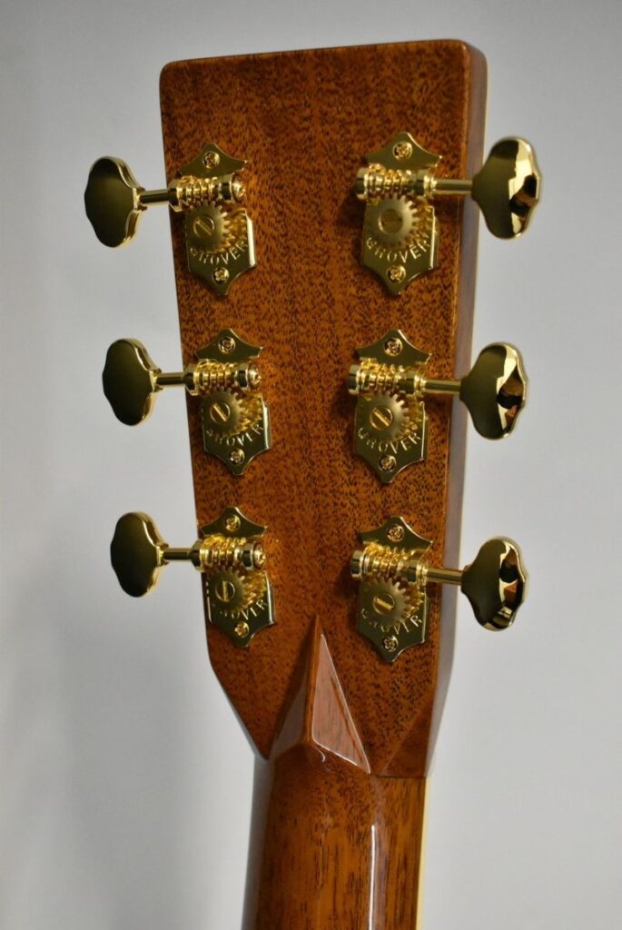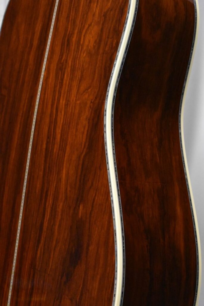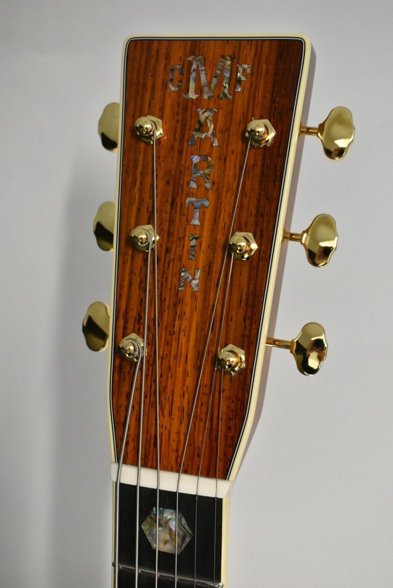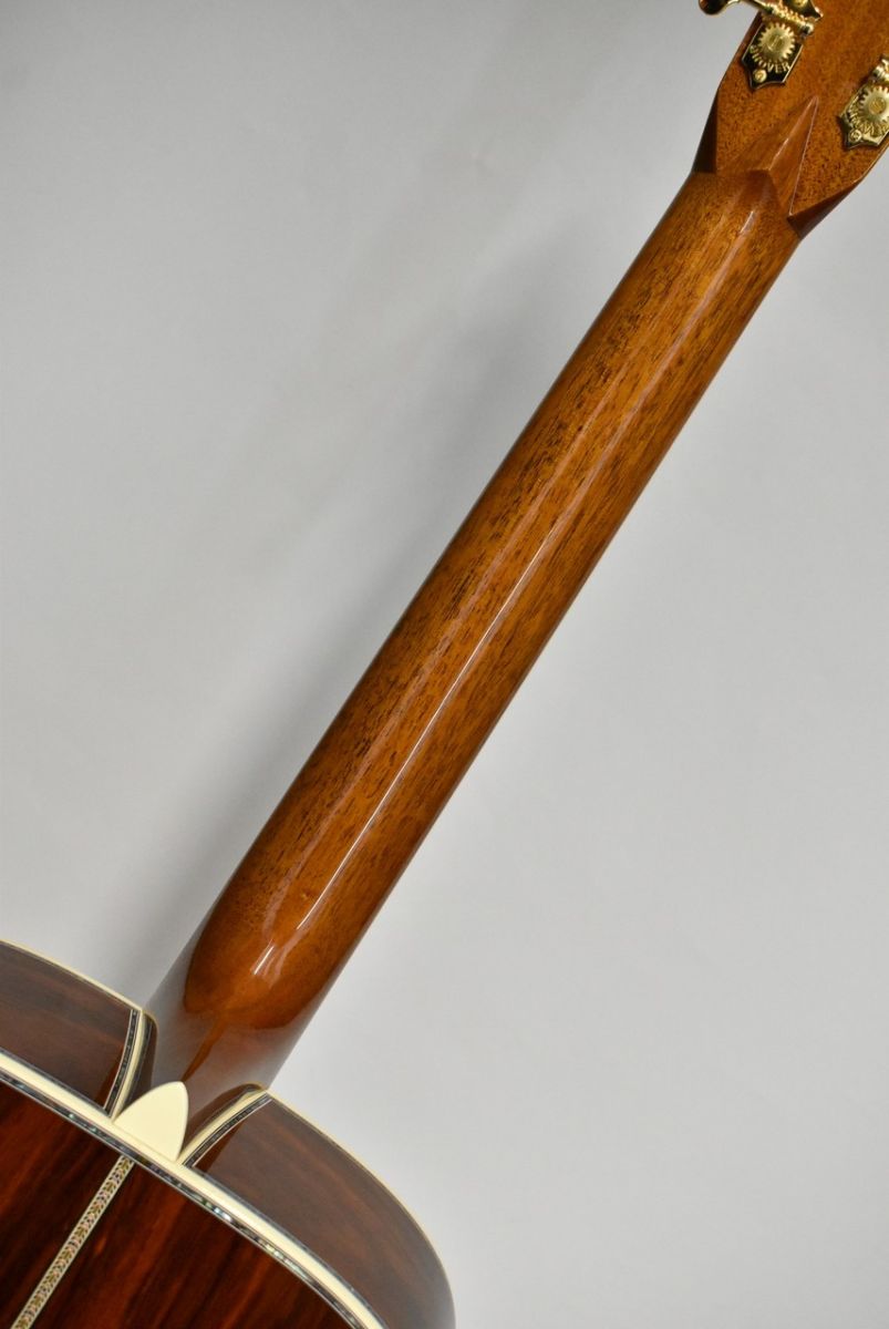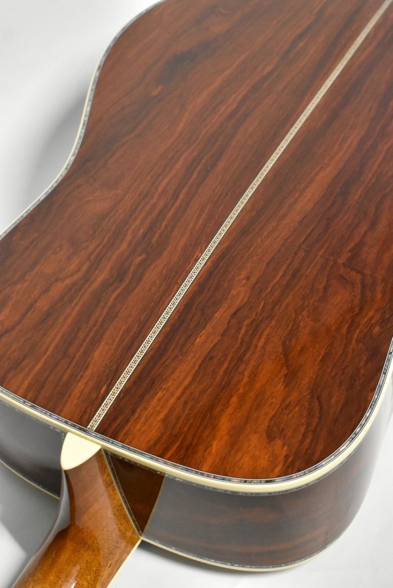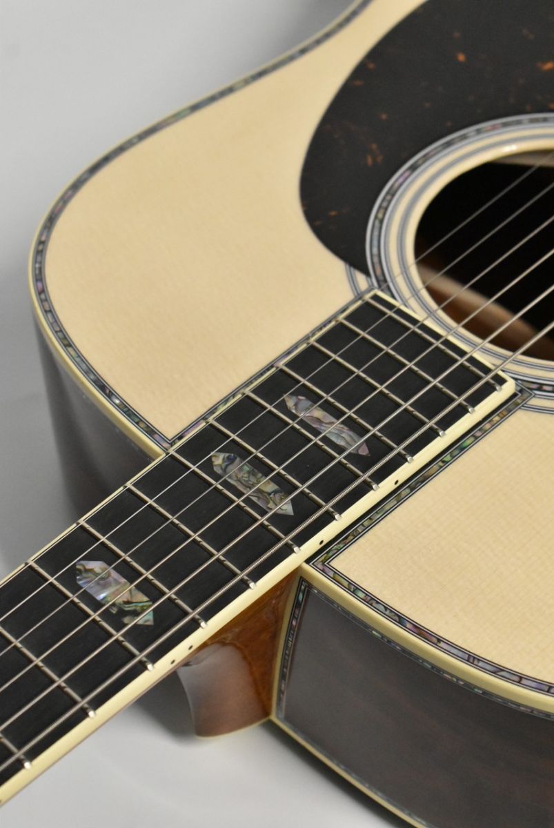 今回入荷したのはD-45のサウンドを更にアップグレードしたカスタム・モデルでトップ材にはイタリアを中心にヨーロッパに広く分布するイタリアン・アルパイン・スプルースを使用。高級ギターに使用される木材で、キメ細かな木目が美しく、豊かで上品な倍音が特徴です。トップの塗装は美しい木目を引き立てる為に、着色無しのクリアーフィニッシュ、繊細な鳴りが際立つシンフィニッシュで仕上げております。
