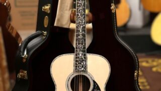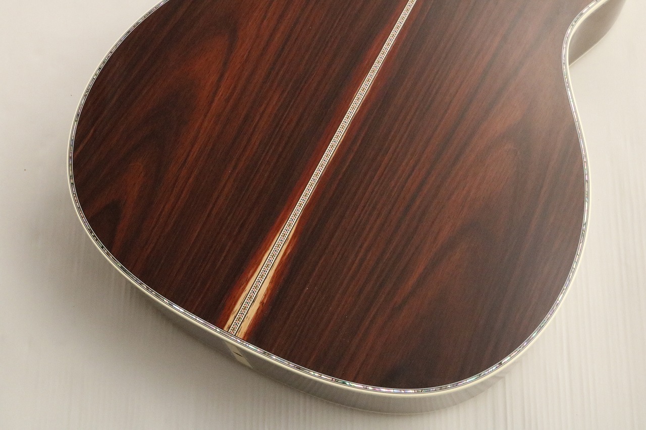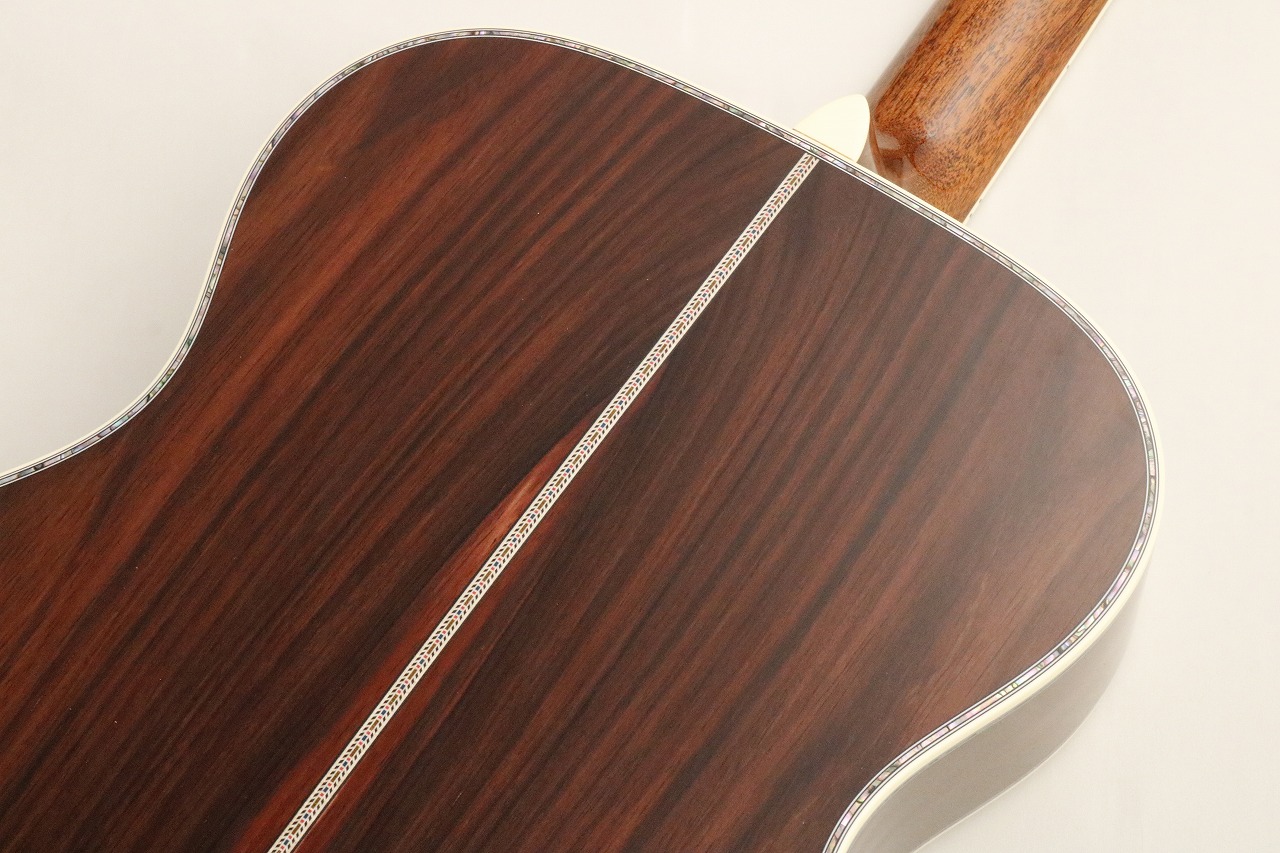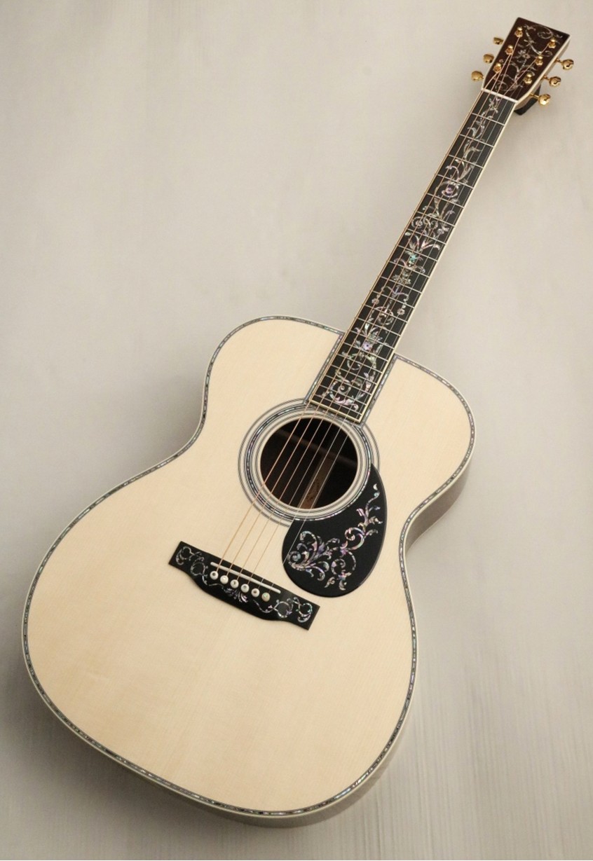 Martin Style45はMARTINギターの最高峰といえるD-45の製作と共に生まれました。1933年から1942年に製造された91本のD-45。1968年から再生産が始まってから現在まで、アコースティックギターの最高峰モデルと言われており、全てのアコースティックギターファンの憧れのモデルとして知られています。そんな肩書きは美しい見た目や、価格から来るものではなく、間違いなくMartinのアコースティックギターの中でも優れた響きを持つギターであるが故のものです。低音から高音まですべての帯域で美しく荘厳なひびきを持ち、1ストロークだけでも圧倒的な存在感が生まれます。選び抜かれた木材の外観も実に美しく、理想のギターと言えるでしょう。今回はそんなD-45をさらに豪華に、そして少し小ぶりな000サイズでオーダーしました。拘りの仕様による豪華絢爛な響きと外観そこに高い演奏性を兼ね備えた特別な一本です。