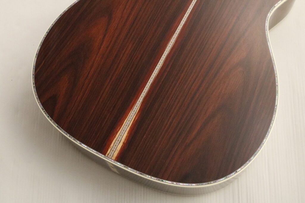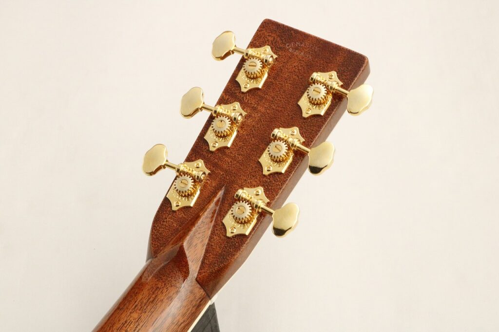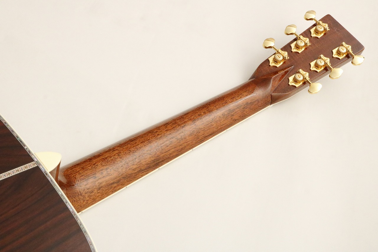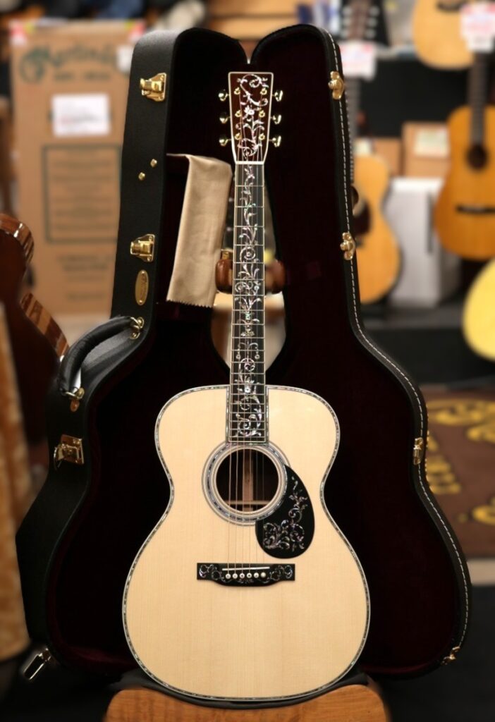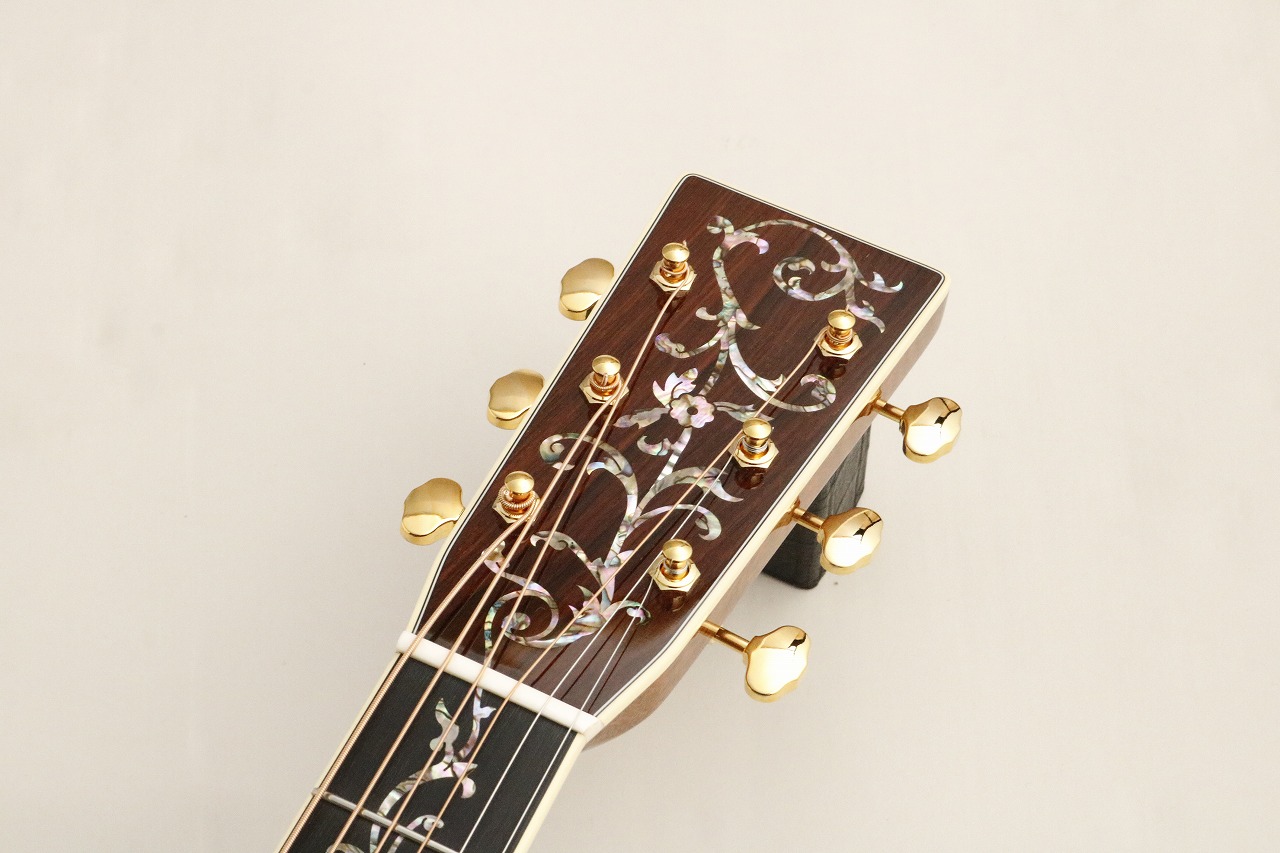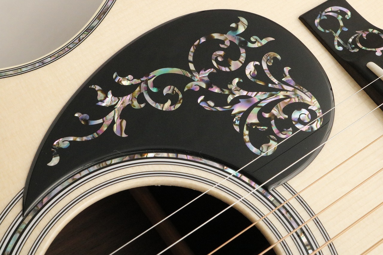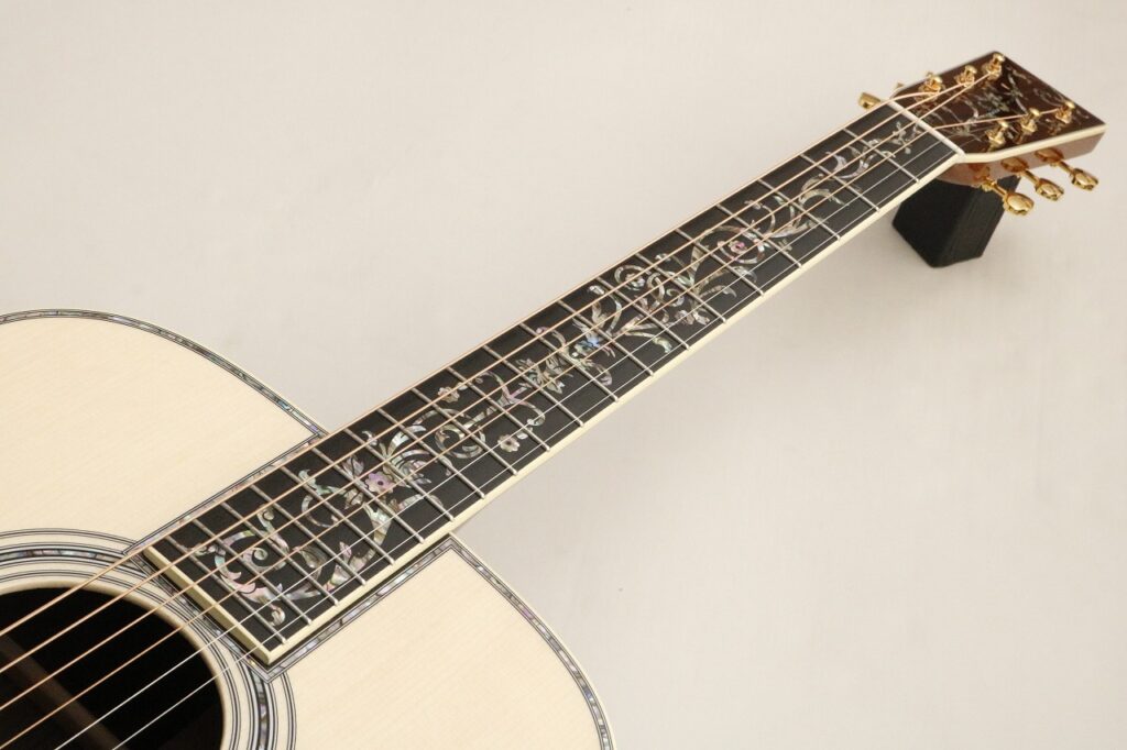 こちらの個体は、000サイズのStyle45をベースに豪華絢爛なツリーオブライフのインレイを施した当店オーダーのカスタムモデル。000サイズの最上位モデルをStyle45に、さらにツリーオブライフの豪華な指板インレイ。通常は縦のMartinロゴが入るヘッドまでもツリーオブライフのインレイを施しています。重要なMartinロゴは、ヘッドプレート裏のバックスタンプで刻印されておりビンテージスタイルの面影も感じられます。面取りされ、渕が滑らかに加工されたピックガードにも、黒々と杢目の詰まったエボニーブリッジにも実に繊細かつダイナミックなツリーオブライフのインレイが入っています。豪華さは外観だけではなく、トップ板にアディロンダックスプルース、ブレーシング材にも滑らかにスキャロップド加工されたアディロンダックスプルースを使用しております。この個体に関しては写真撮影で白飛びしてしまいそうな綺麗なアディロンダックスプルースが使用されており、今後このトップが飴色に彩られていくのが楽しみな個体。サイドバックにも力強く木目の美しい厳選されたプレミアムグレードのグアテマラローズウッドを使用。豪華な外観に呼応するような豪華で煌びやか、そして迫力のある素晴らしいサウンドを響かせてくれます。トップ、サイド、バック、ネックやヘッドプレートに至るまで美しい杢目の木材が選択されており、眺めているだけでも楽しめる個体です。