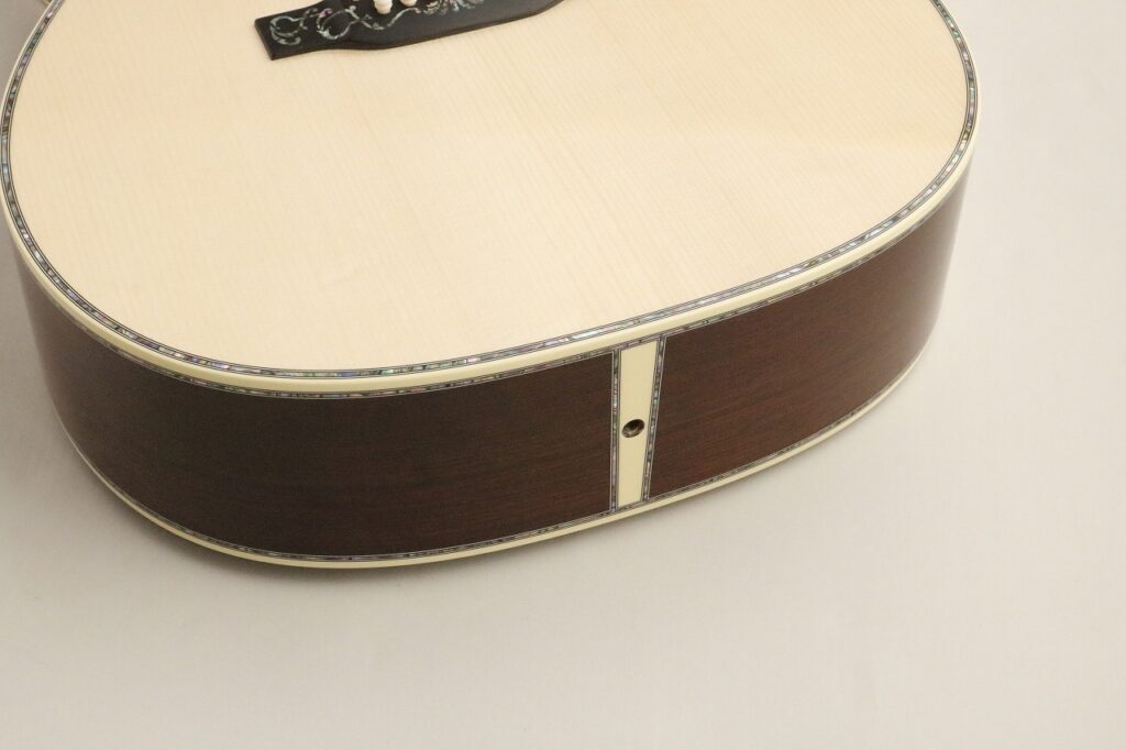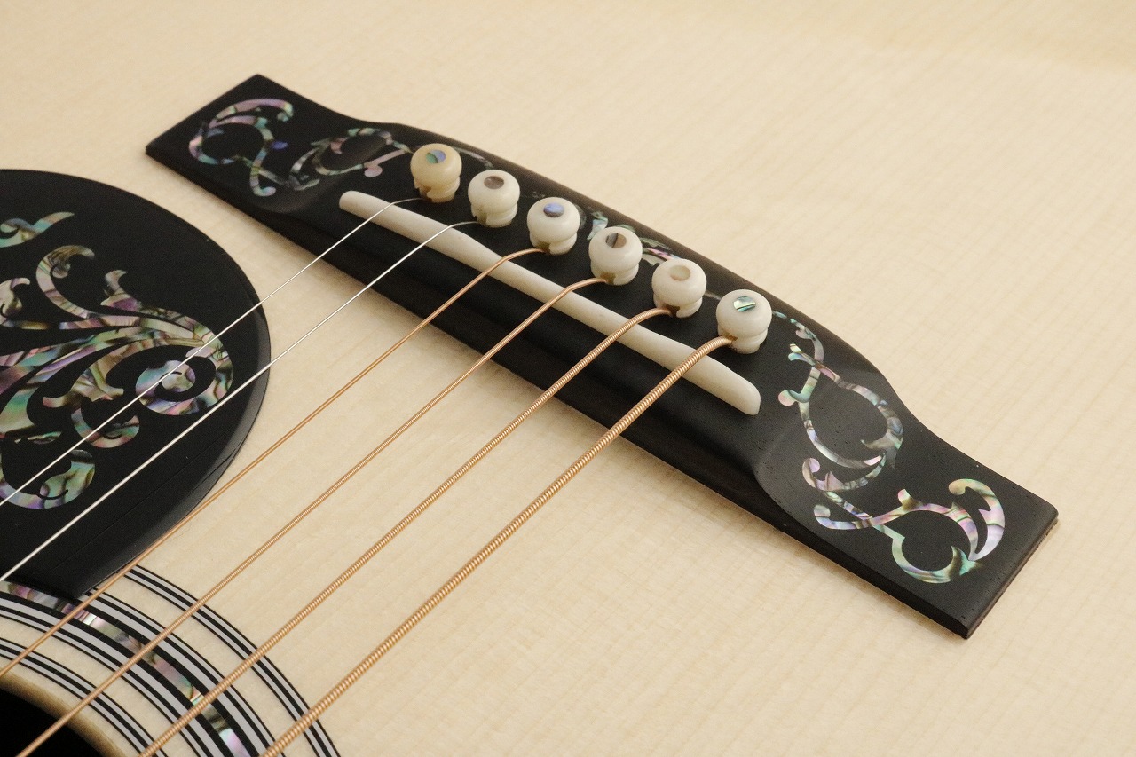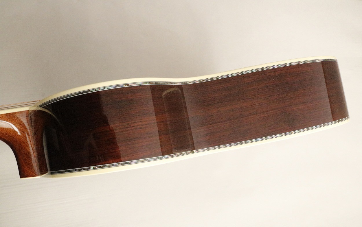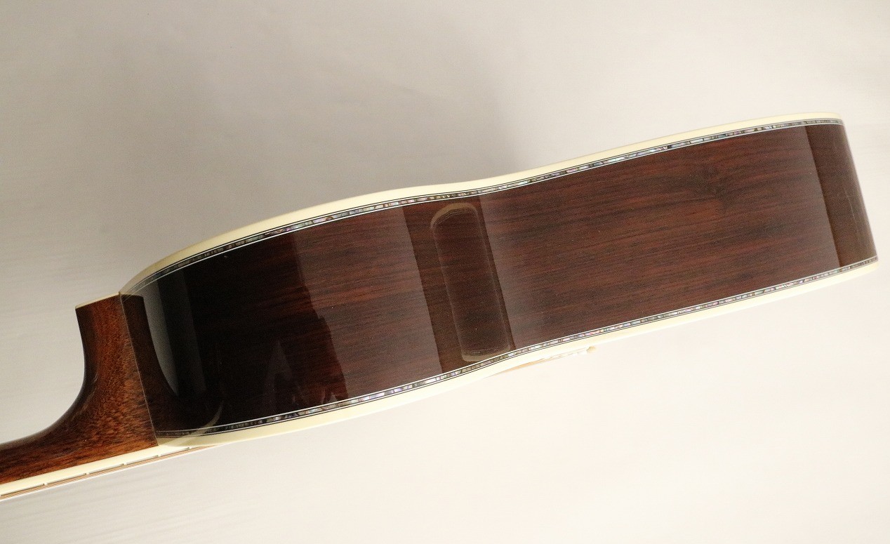 ワンストローク奏でるだけででビシビシと感じる個体の魅力。ローズウッドにありがちな立ち上がりの重さなどは皆無といっても過言では無く、ストロークをするピックが6弦に触れた瞬間その響きが体を伝わり耳に届くような立ち上がりの良さを感じます。音の一つ一つが粒立ち、ガラスでコーティングされたようなキラッと輪郭のハッキリしたサウンドがボディの奥深くから湧き上がり、深みのある響きを生み出してくれます。豪華絢爛な外観に目が奪われてしまいますが、サウンドも自信を持ってオススメ出来る一本です!