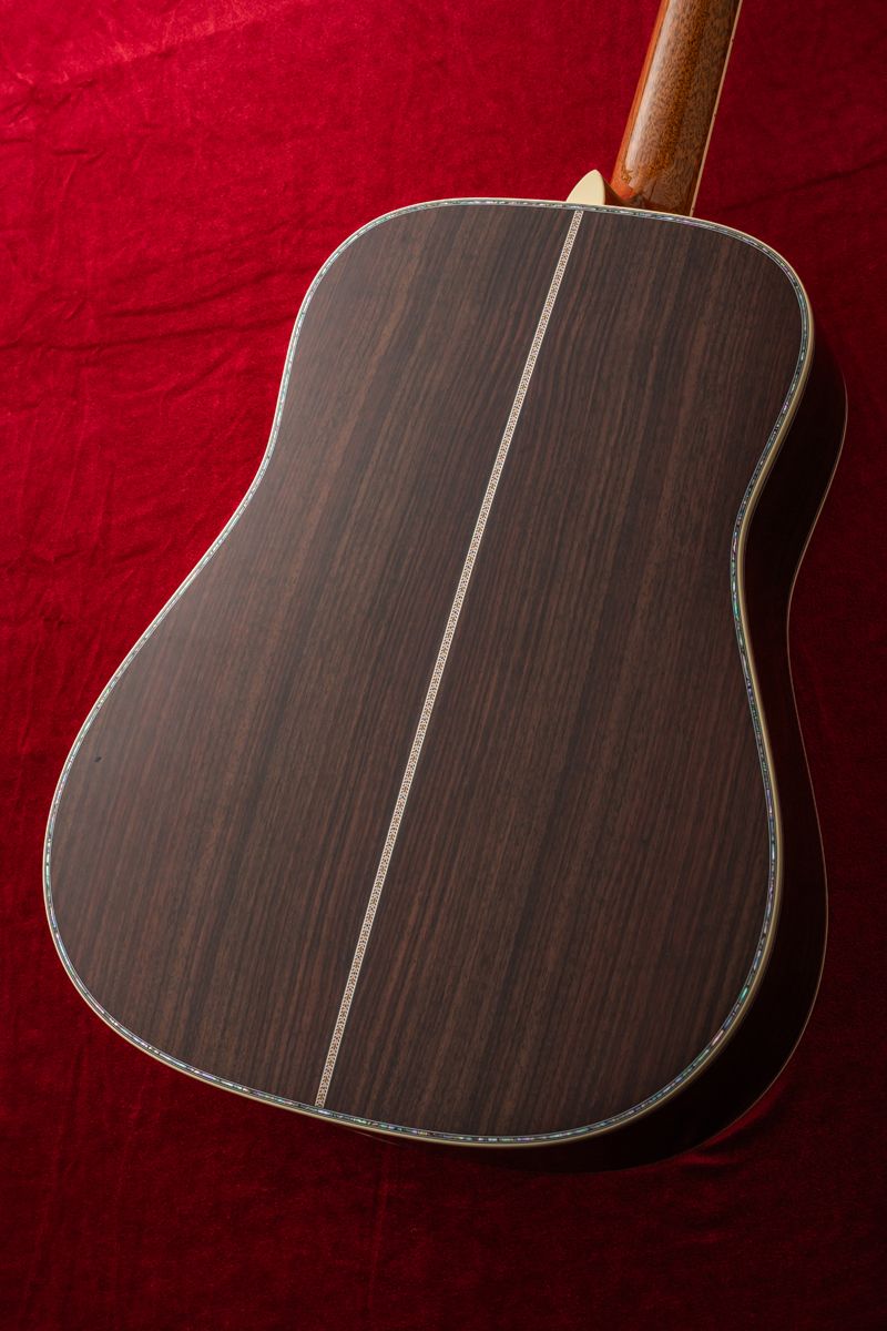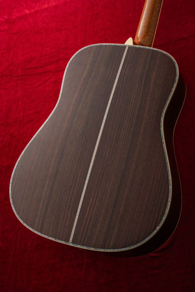 非常に目の詰まったプレミアムグレードに相応しいシトカ・スプルーストップ、目の詰まった極上のインディアン・ローズウッドバック。