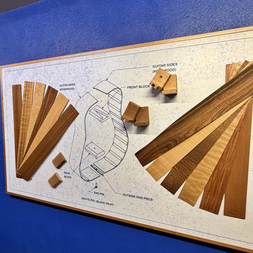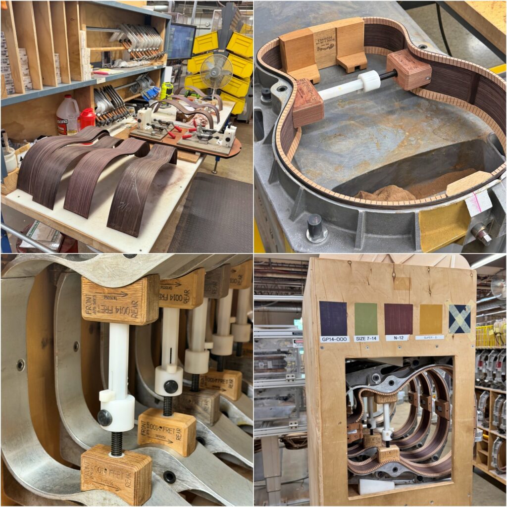 ・ブレイス接着後の乾燥と成形、サイドの組み立て作業、そしてボディとネックを接合する工程前の様子です。