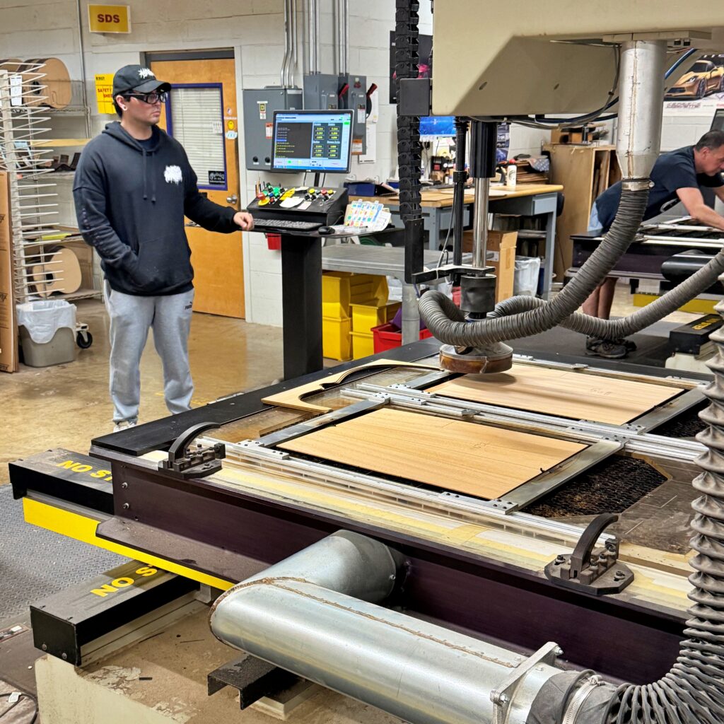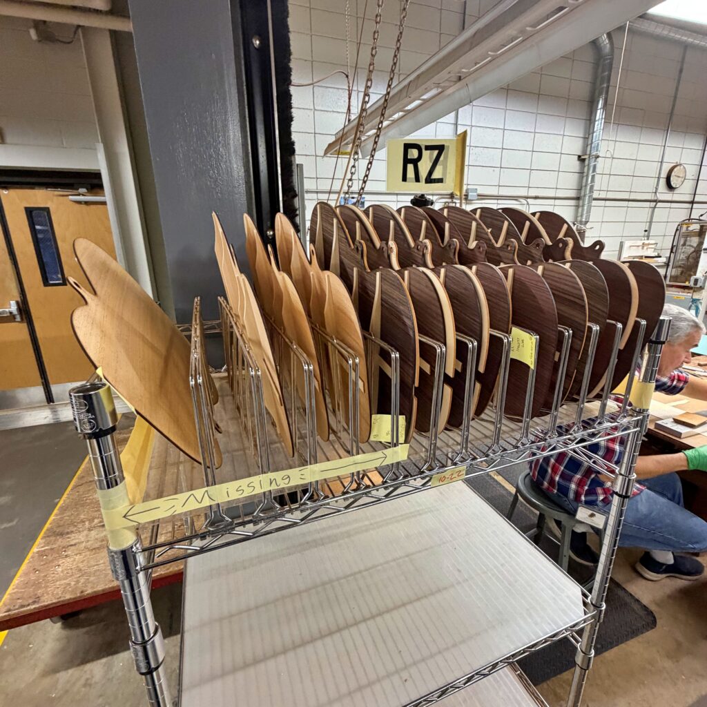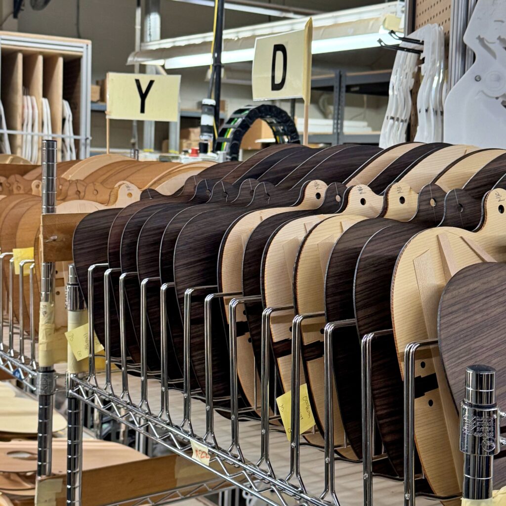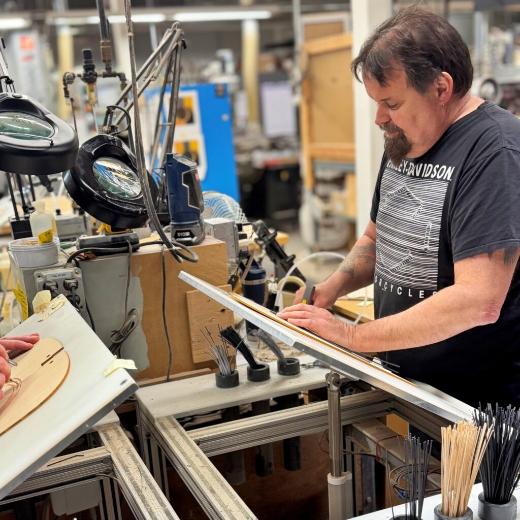 ・CNCルーターによる切削加工は、非常に高い精度と再現性を誇り、複雑な形状の加工も効率的に行うことができ、ギターの装飾であるインレイ、バインディング、パーフリングといった細かい部分は、職人がひとつひとつ手作業で丁寧に取り付けています。