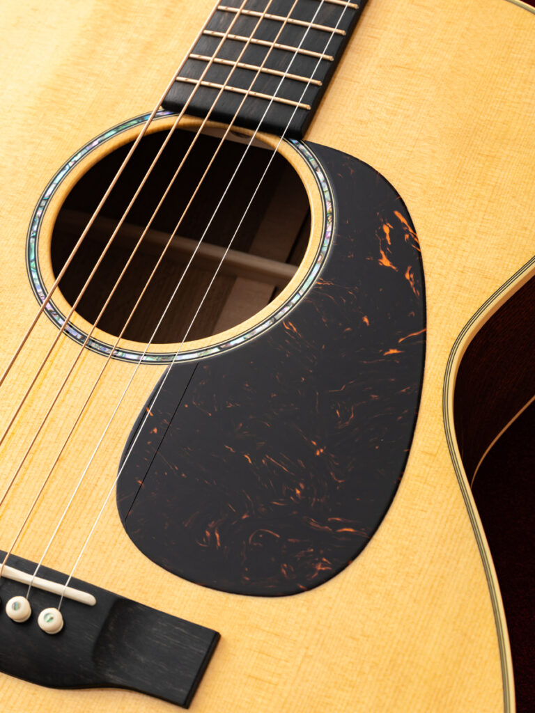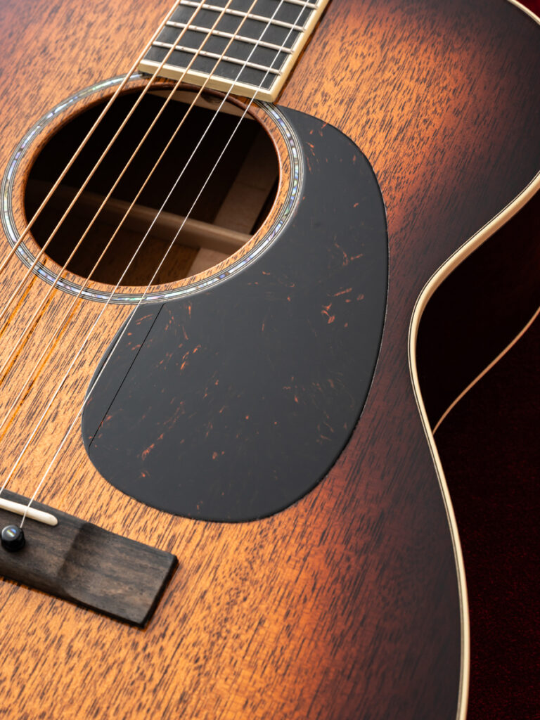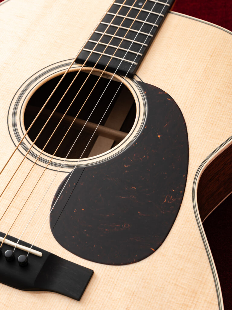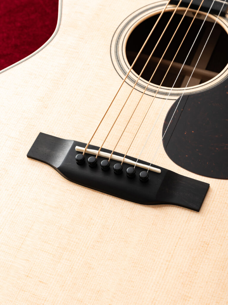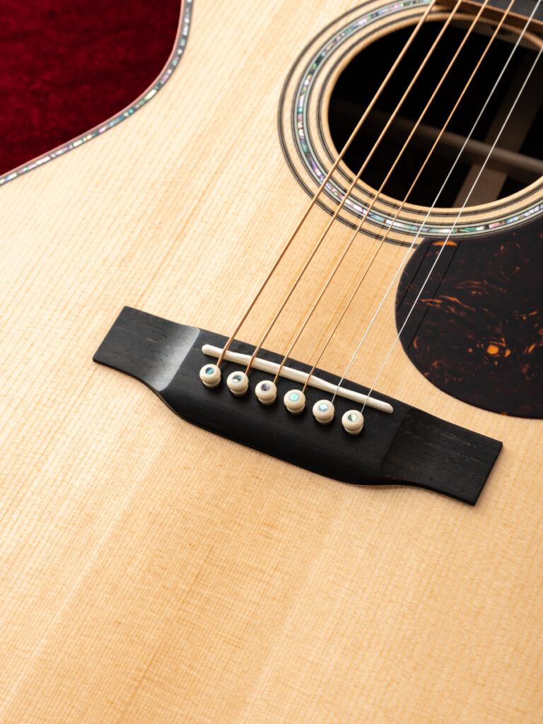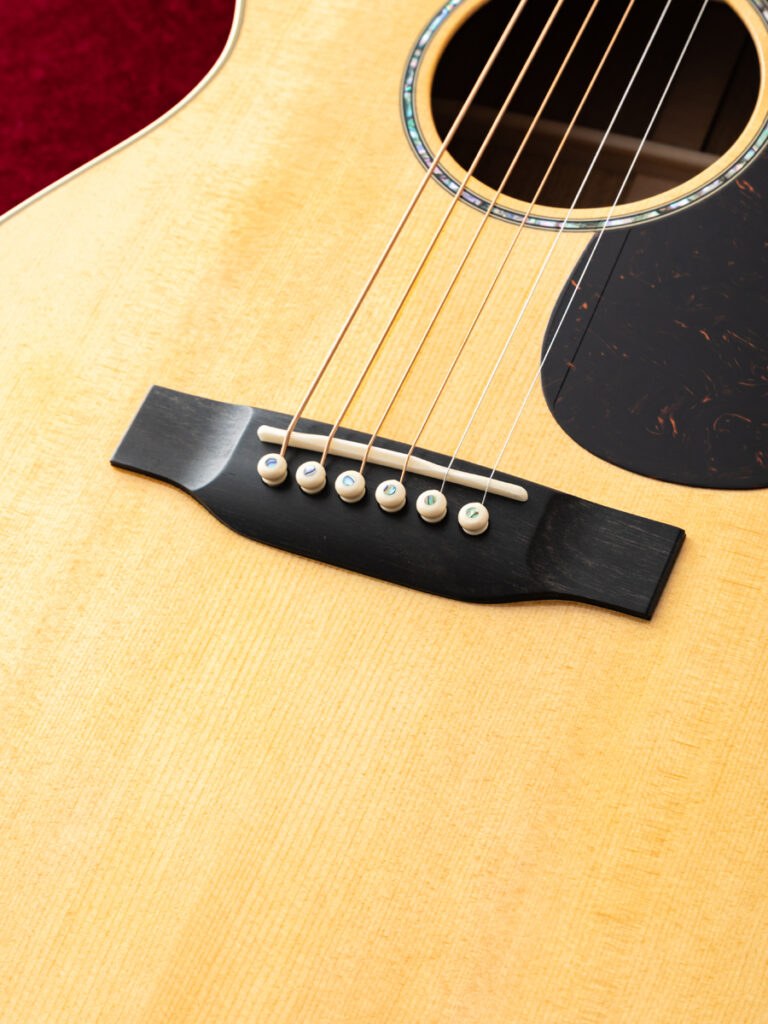 ピックガードなしのストレートブリッジにより、シンプルながらも高級感のある佇まいを持ち、品格を漂わせます。