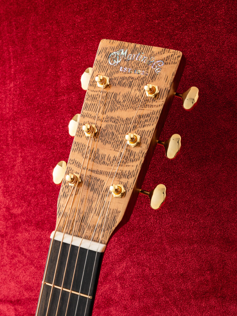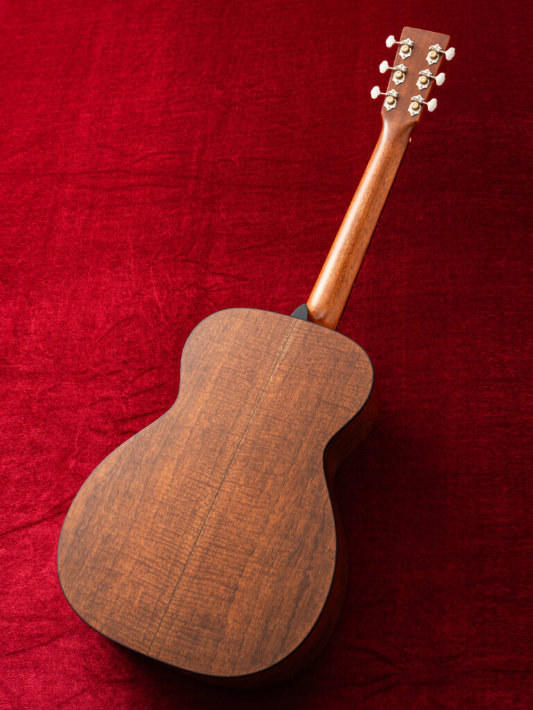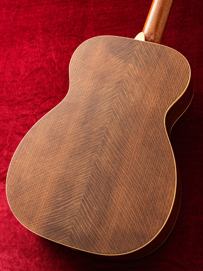 トップには霜降りが美しいプレミアムグレードのシトカ・スプルース、バックには目の詰まったプレミアムグレードのフレイムド・マホガニーを贅沢に使用したカスタム。