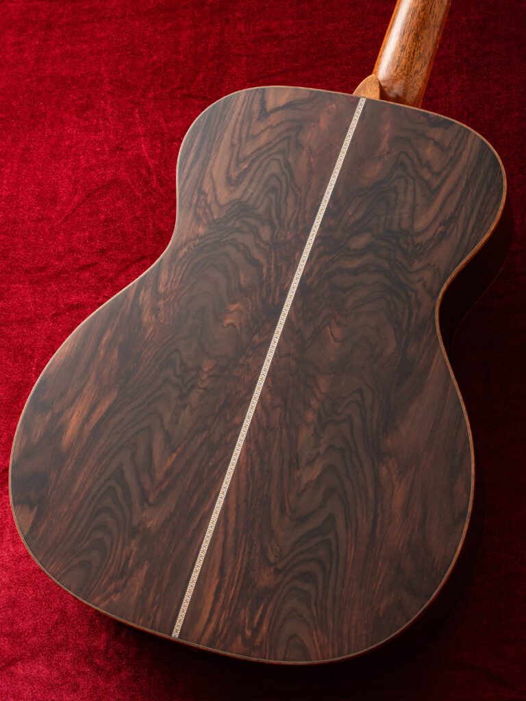 そして、バックのプレミアムグレードのワイルド・グレイン・イースト・インディアン・ローズウッドは、あまりに魅惑的な杢目で妖艶な雰囲気を醸し出しており、フレイムド・コアバインディングと組み合わさることで、さらに高級感のある美しい外観に仕上がっています。