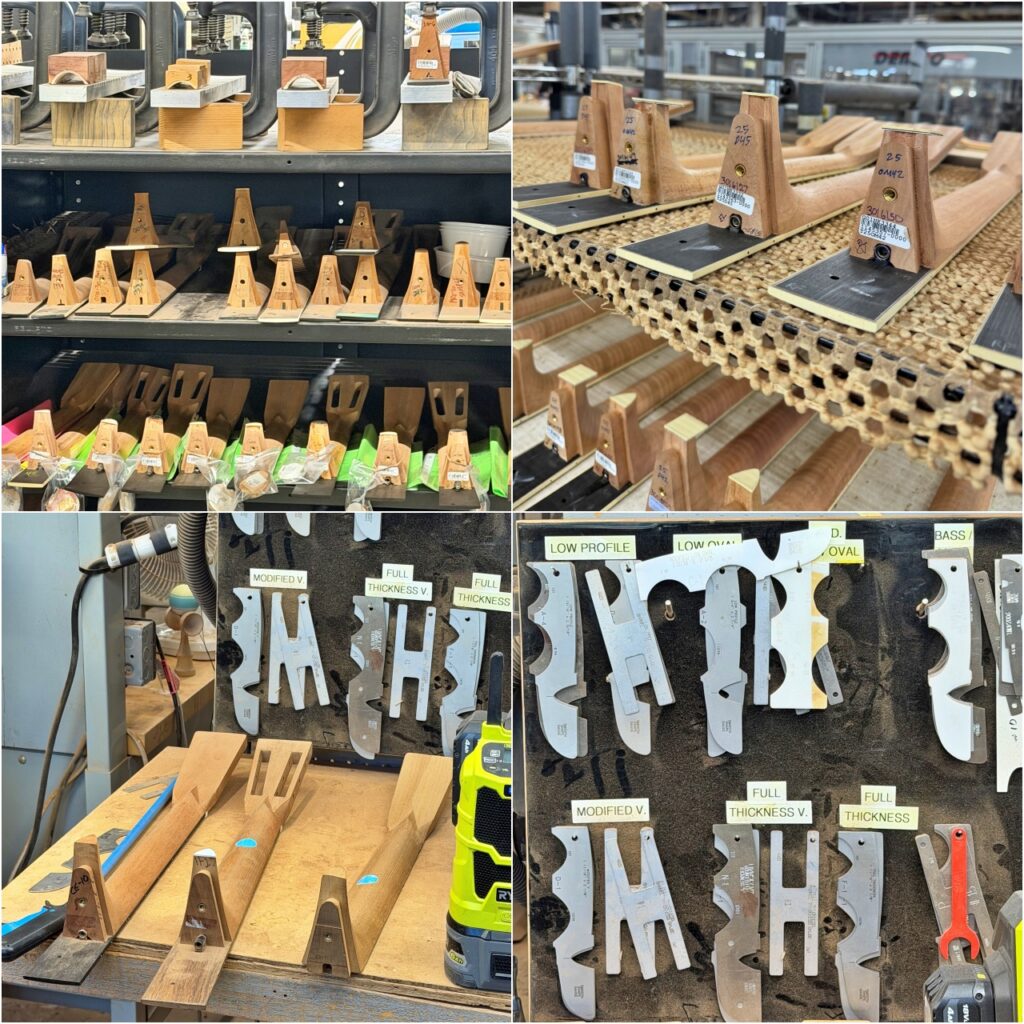 ・ネックをボディに接合する前や塗装、ペグ穴加工の前の段階では、ネックのジョイント部分にモデルごとの区分けがされています。