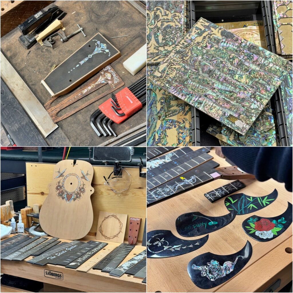 ピックガードと指板に施される、様々なカスタムデザインの装飾パーツ等、高度で緻密な装飾作業が行われていました。