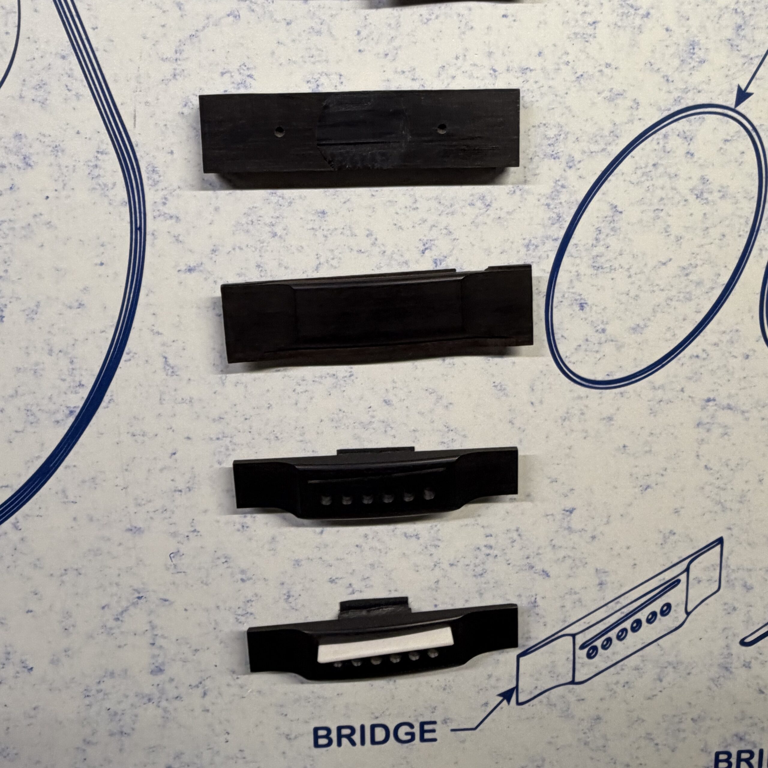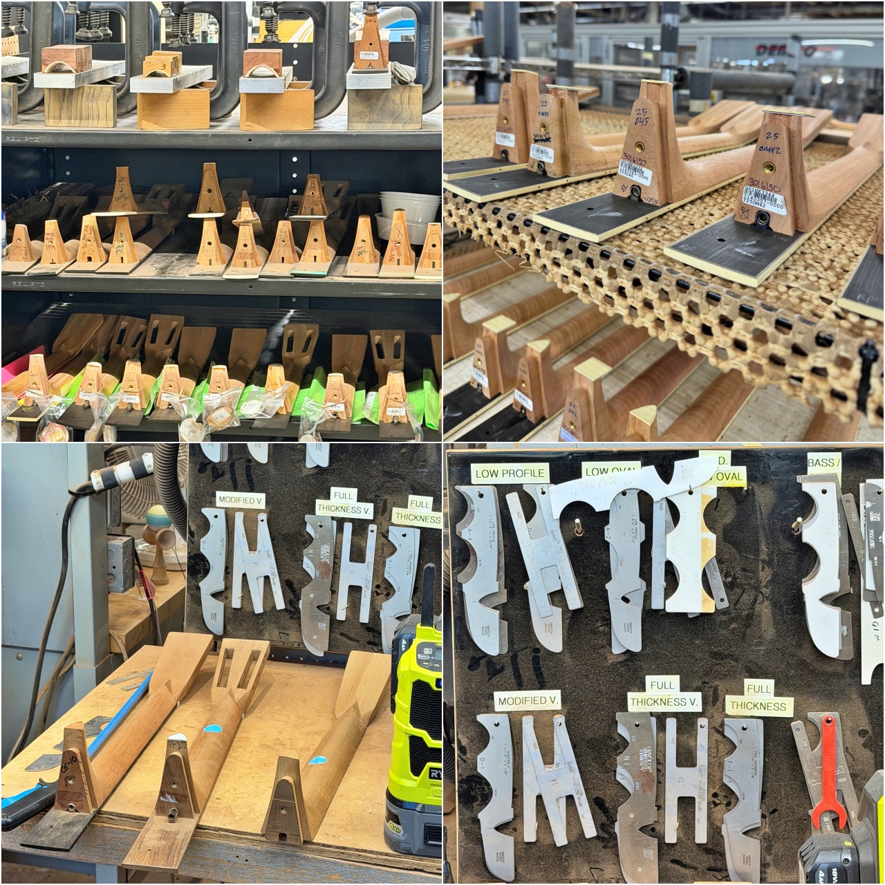 ・ブレイス接着後の乾燥と成形、サイドの組み立て作業、そしてボディとネックを接合する工程前の様子です。