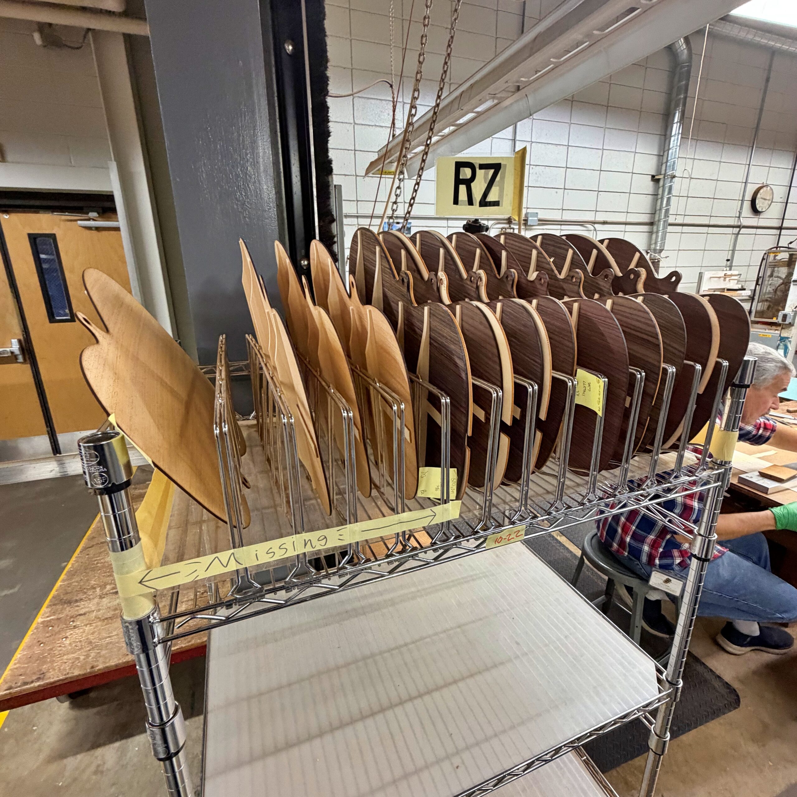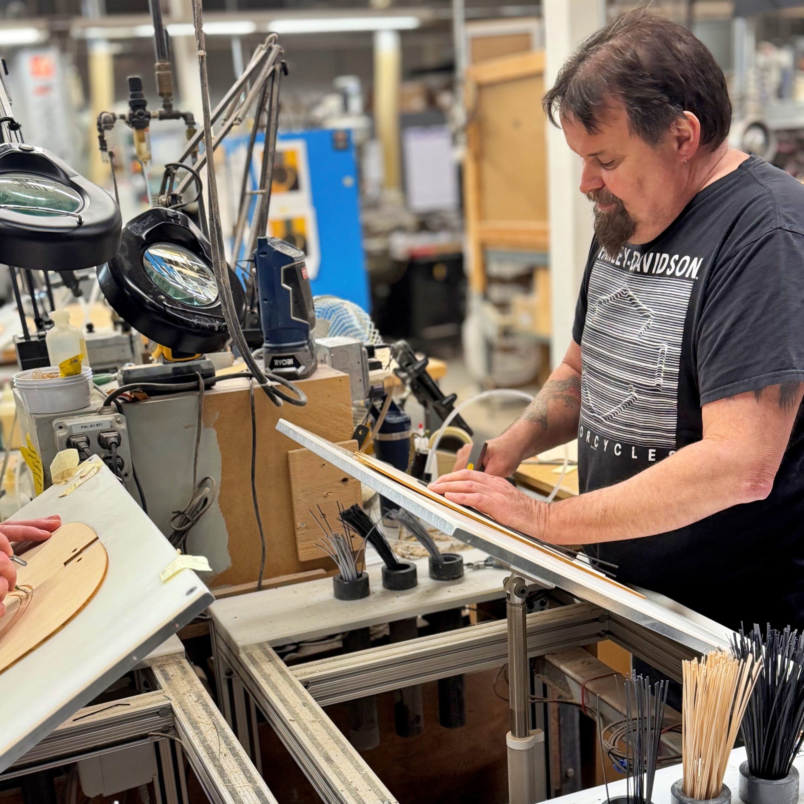 ・職人が手作業でネックを削る丁寧な工程やバインディングをボディに取り付けてマスキングテープで固定する細やかな作業が行われています。
