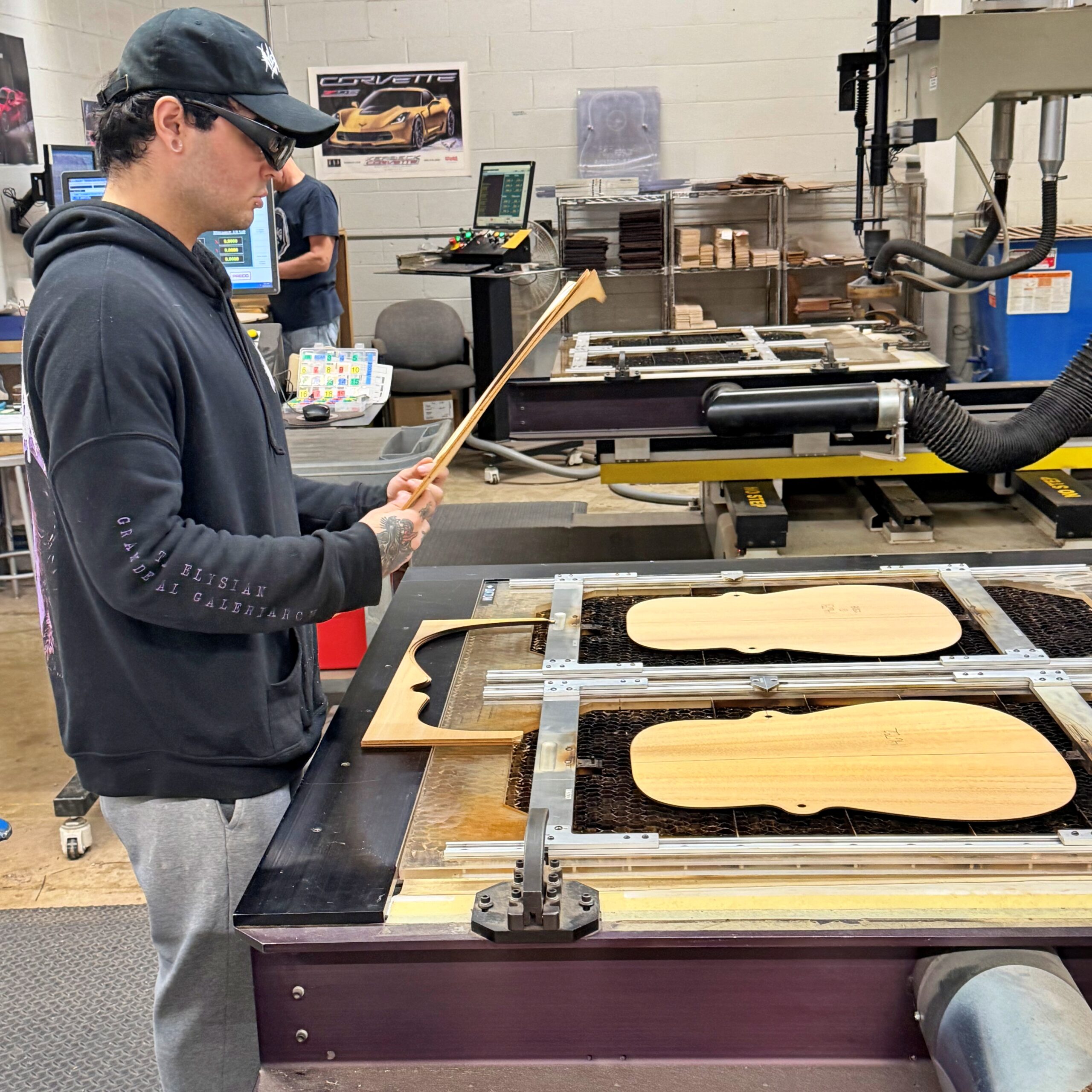 ・CNCルーターによる切削加工は、非常に高い精度と再現性を誇り、複雑な形状の加工も効率的に行うことができ、ギターの装飾であるインレイ、バインディング、パーフリングといった細かい部分は、職人がひとつひとつ手作業で丁寧に取り付けています。