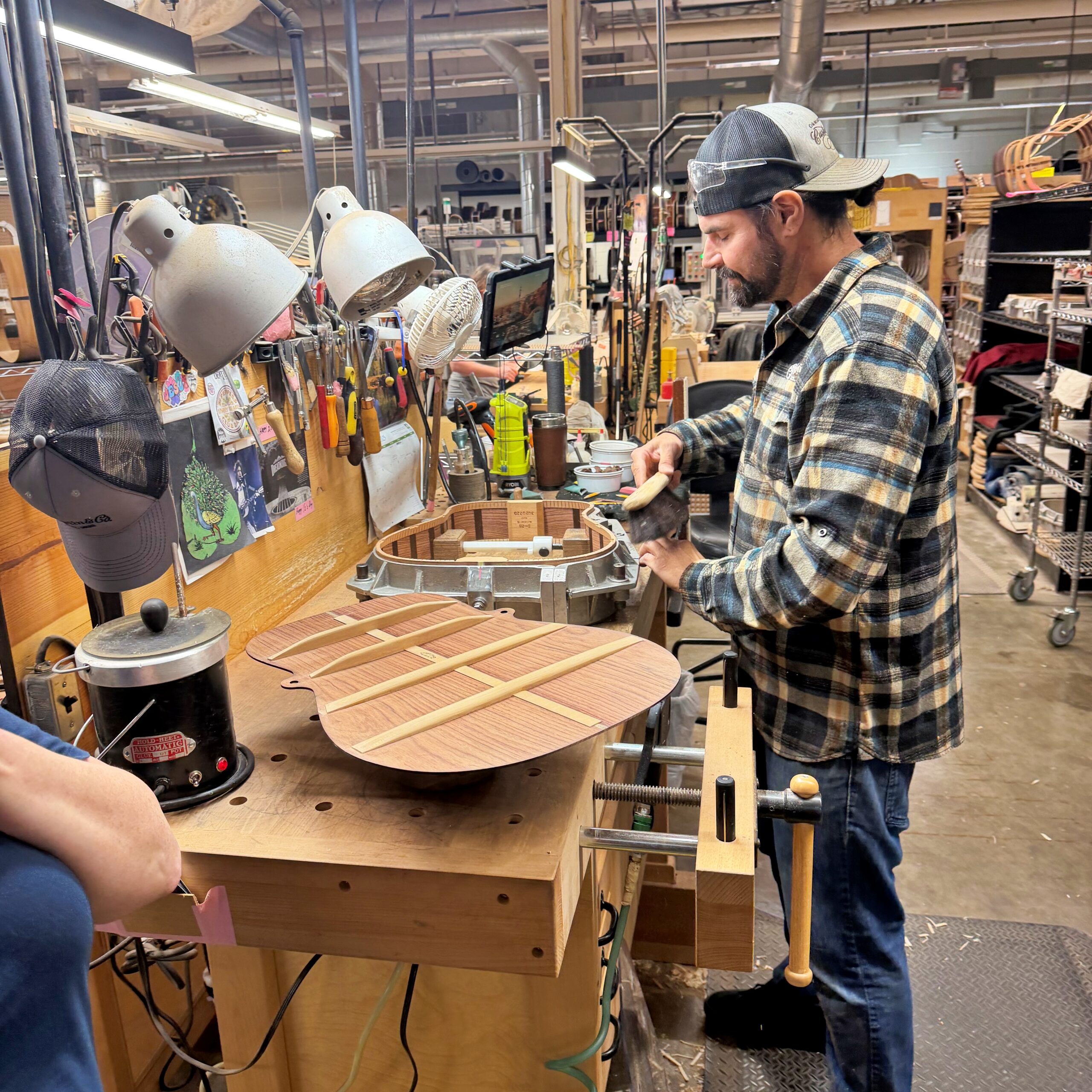・側板を熱と蒸気でギターのカーブに合わせて曲げ、型にセットしたうえでブロックやライニング材を接着・固定します。