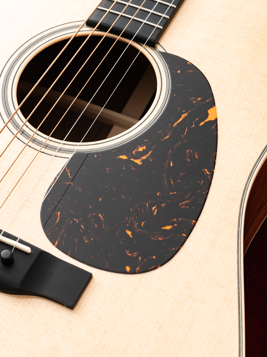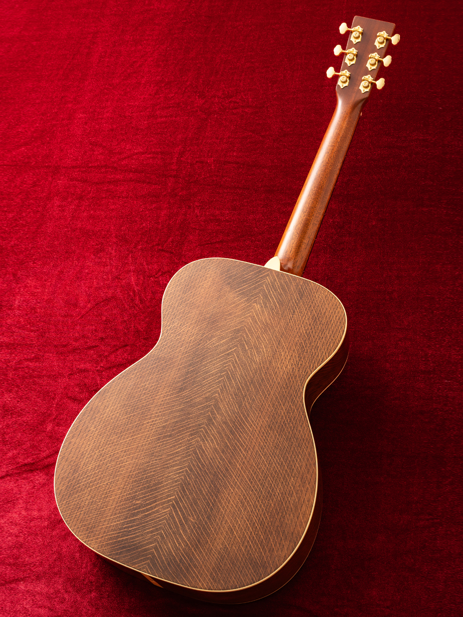 トップには霜降りが美しいプレミアムグレードのシトカ・スプルース、バックには目の詰まったプレミアムグレードのフレイムド・マホガニーを贅沢に使用したカスタム。