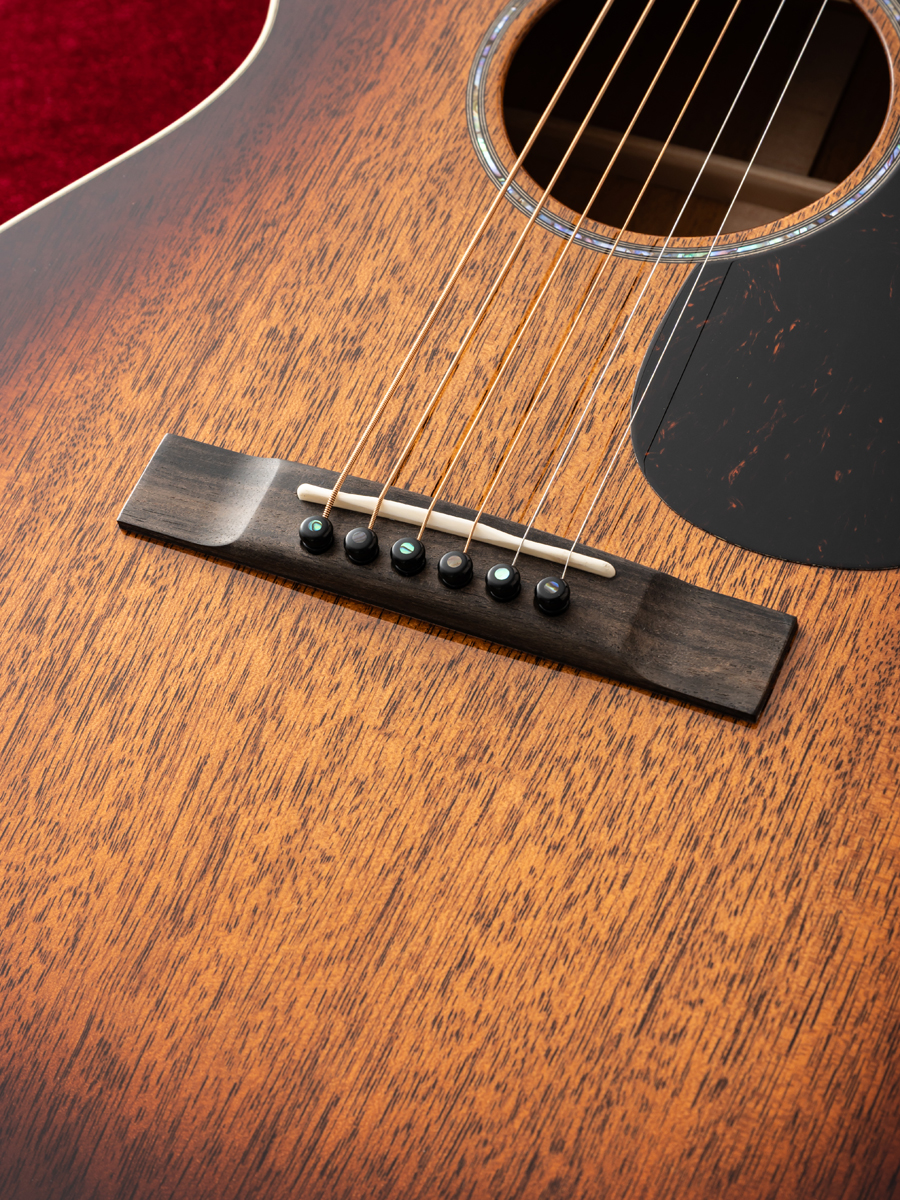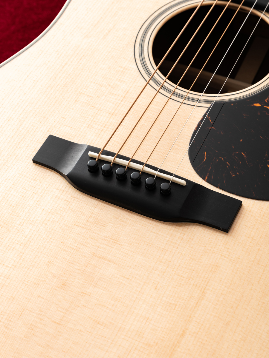 ピックガードなしのストレートブリッジにより、シンプルながらも高級感のある佇まいを持ち、品格を漂わせます。
