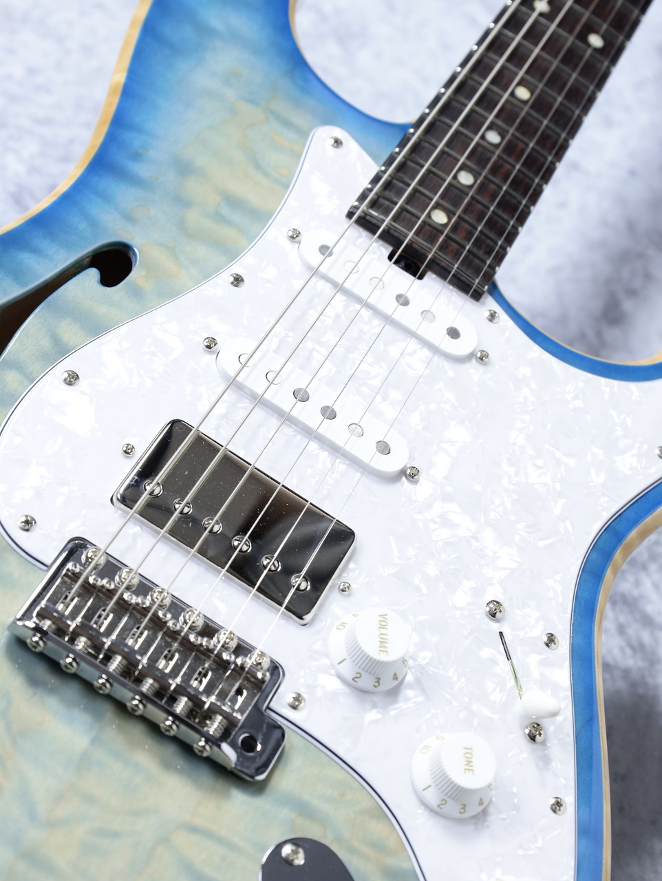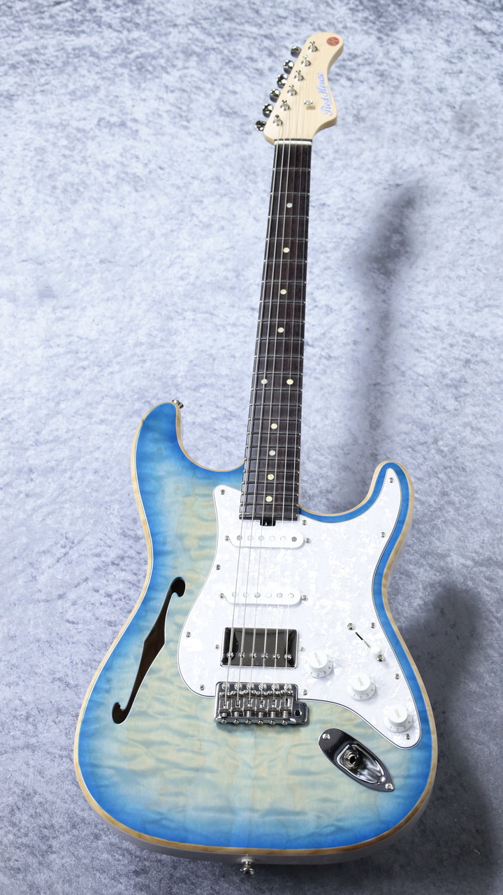 玉杢のようなの杢目の美しいキルトを選定・採用し、杢目を活かした淡めのブルーバーストで着色。ヘッドロゴのカラーリングもブルーでボディと併せており、特別感あり非常にお洒落です。ボディトップにはナチュラルバインディングが入っておりますが、エッジが丸められており非常に美しい仕上がりです。ボディバックはアッシュ材を採用。せっかくなので、アッシュの杢目を活かした「ホワイトブロンド」にしており、バイカラーが非常にお洒落。Fホールで軽量化されていることもあり、チャキチャキとしたサウンドによく合うスペックです。