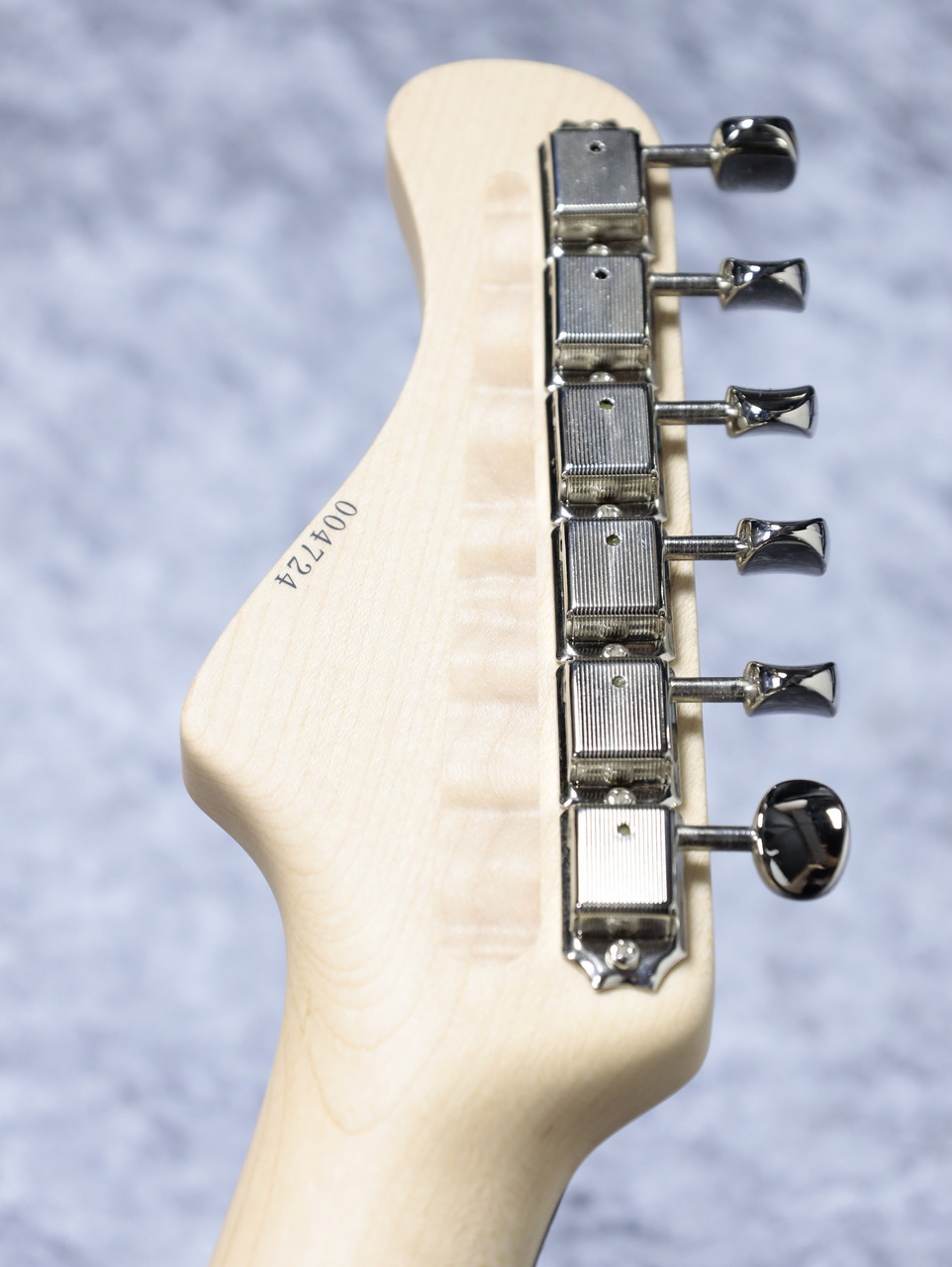 ネックはRed Houseの標準であるUVシェイプを選択。細すぎず・太すぎず・丸みを感じるしっかりとした握り応えですが、非常に持ちやすい不思議なネック。艶のあるローズウッドに輝くイエローパールのドットが映えております。ヘッド裏にはHead Vibration Controllerも採用し、ヘッド裏には強化材を仕込みヘッドの鳴りを調整。ミディアムジャンボ 22フレットに240R、ストラトらしさを残しつつプレイヤビリティにも寄り添った考え抜かれたスペックは、長年の経験があるビルダーならではの思想です。