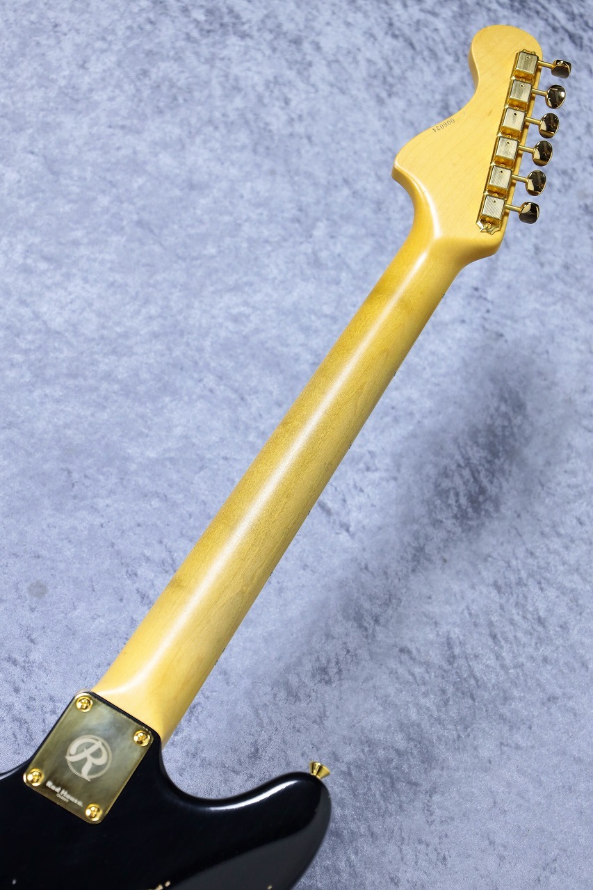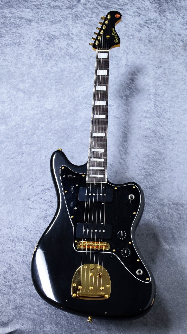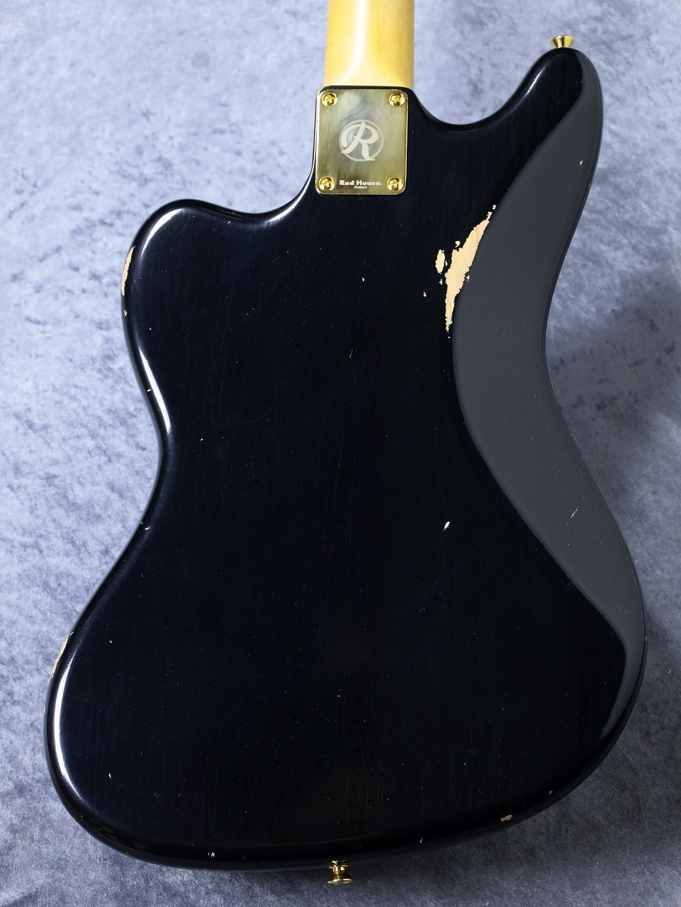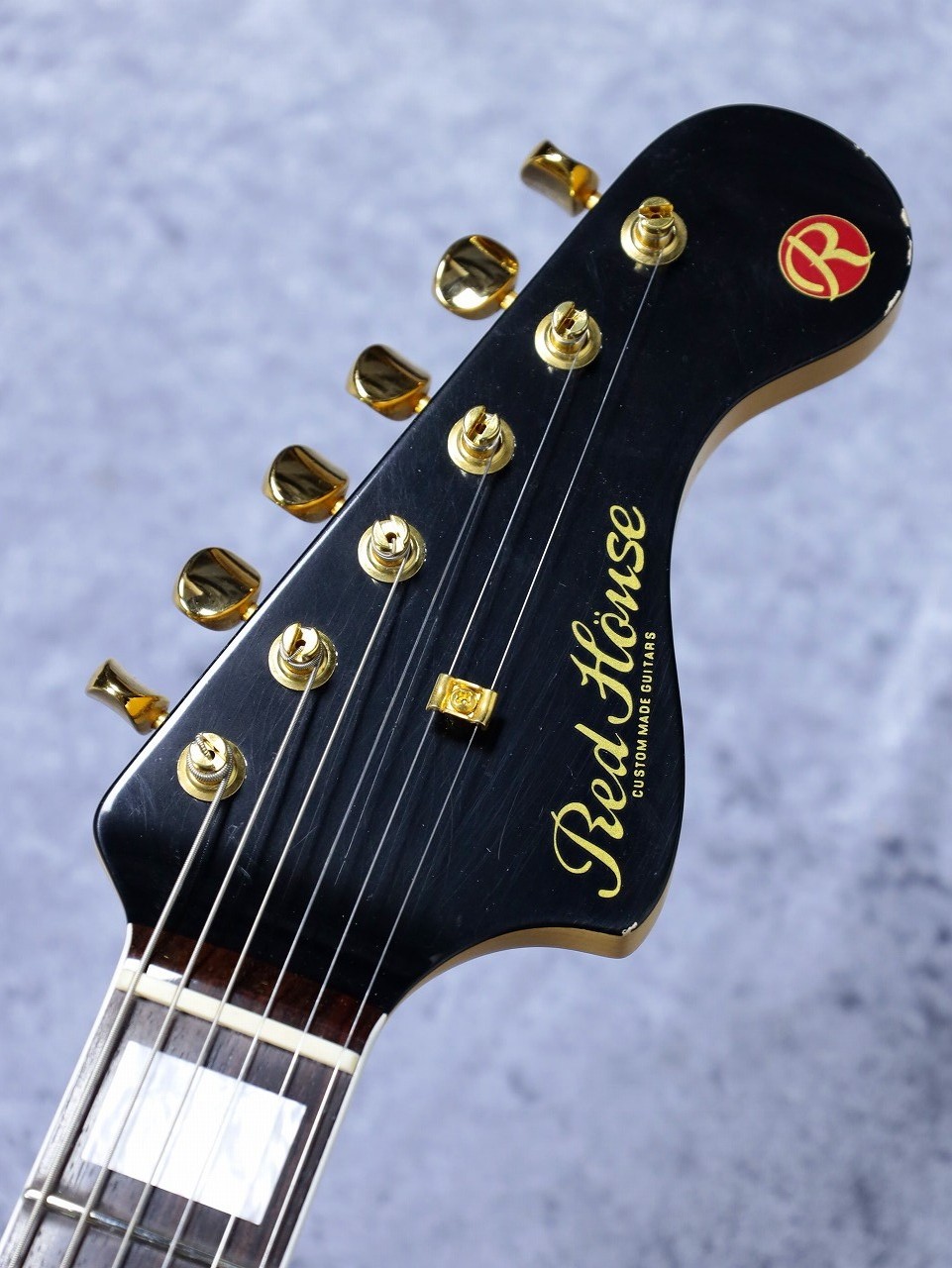 全体的にはヘッドからボディまでオールブラックでまとめており、ピックガードはあえての黒-白-黒の3plyであえてピックガードラインの白が目立つ様に工夫しました。オールラッカーでエイジングが施されており、薄い塗装の質感が際立ちます。もともとレッドハウスは音の立ち上がりの速さを大事にしているブランドですが、その良さが更に際立ち、思わずかき鳴らしたくなるほど気持ちの良い分離感を味わうことがどできます。