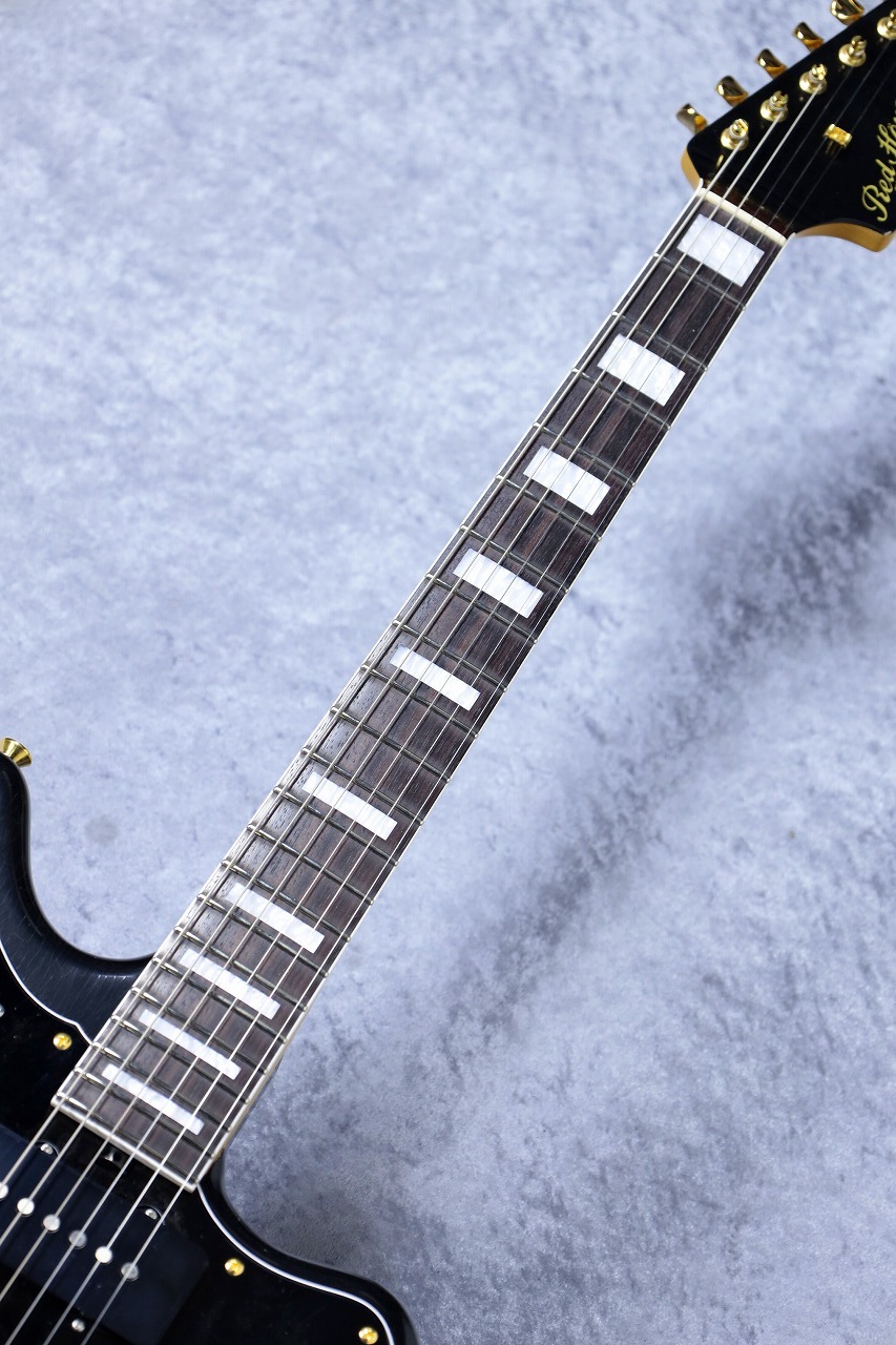 ネックはRed Houseの標準であるUVシェイプを選択。細すぎず・太すぎず・丸みを感じるしっかりとした握り応えですが、非常に持ちやすい不思議なネック。艶のあるローズウッドには特別に指板サイドにはバインディングを施し、更にはブロックポジションインレイで個性を演出しました。ミディアムジャンボフレットに9.5R、オリジナルらしさを残しつつプレイヤビリティにも寄り添った考え抜かれたスペックは、長年の経験があるビルダーならではの思想です。細かいですが、弦落ちしないブリッジなのも有難いポイントです。